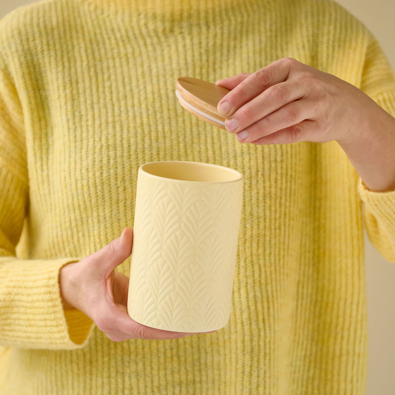 Στρογγυλό δοχείο τροφίμων για την κουζίνα σας με μοντέρνο σχέδιο. Είναι κατασκευασμένο από κεραμικό υλικό σε κίτρινο παστέλ χρώμα με ανάγλυφες λεπτομέρειες. Έχει καπάκι από ξύλο bamboo σε μπεζ χρώμα που κλείνει αεροστεγώς, καθώς διαθέτει δακτύλιο σιλικόνης, για να παραμένουν τα τρόφιμα φρέσκα. Ιδανικό για να αποθηκεύσετε τα τρόφιμά σας και να διατηρήσετε οργανωμένη την κουζίνα και τα ντουλάπια σας. Χωρητικότητα 720ml. Συνδυάστε το με τα υπόλοιπα είδη της ίδιας συλλογής για ένα ολοκληρωμένο αποτέλεσμα στο χώρο σας.