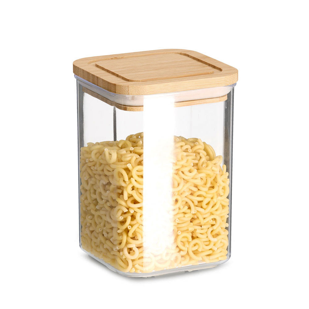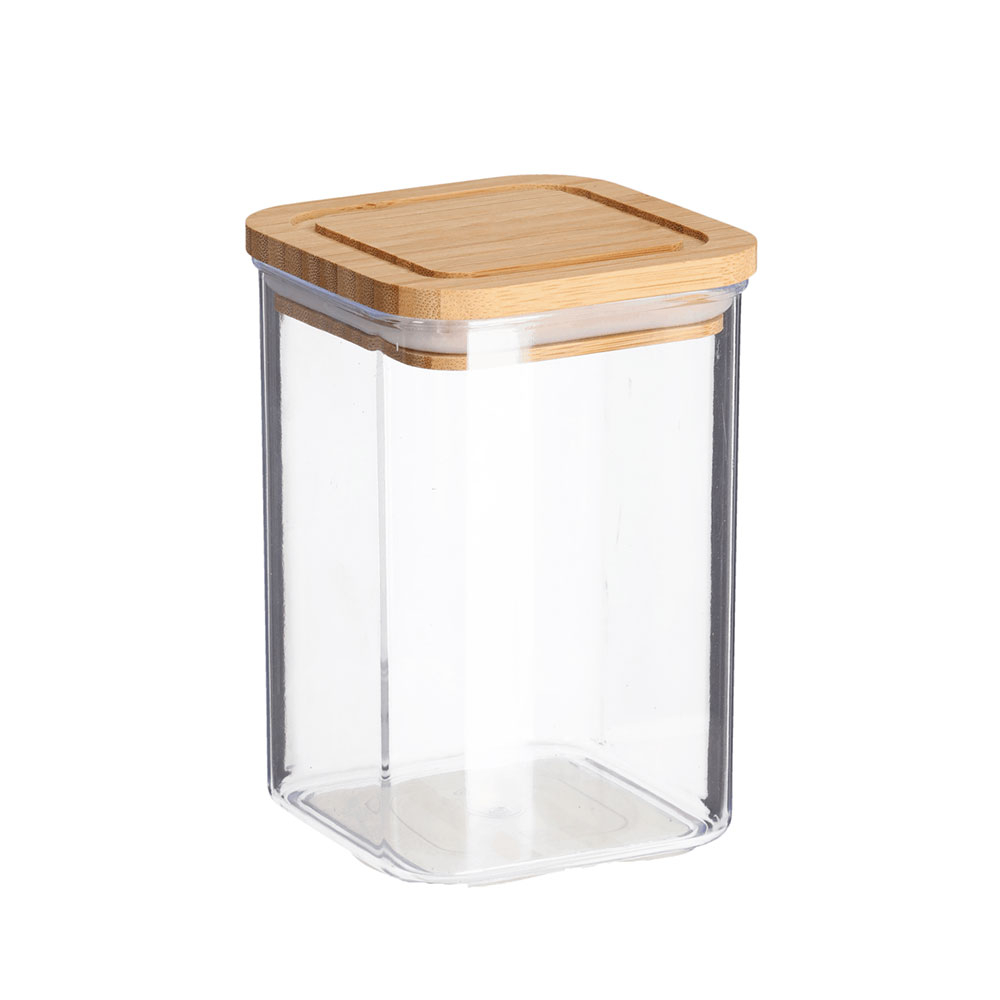 Τετράγωνο διάφανο δοχείο τροφίμων για την κουζίνα σας. Είναι κατασκευασμένο από πλαστικό υλικό, κατάλληλο για επαφή με τρόφιμα. Έχει καπάκι από ξύλο bamboo σε μπεζ χρώμα που κλείνει αεροστεγώς, καθώς διαθέτει δακτύλιο σιλικόνης, για να παραμένουν τα τρόφιμα φρέσκα. Το τετράγωνο σχήμα του το καθιστά ιδιαίτερο πρακτικό και με εύκολη αποθήκευση και στoίβαξη. Ιδανικό για να αποθηκεύσετε τα τρόφιμά σας και να διατηρήσετε οργανωμένη την κουζίνα και τα ντουλάπια σας. Χωρητικότητα 800ml. Συνδυάστε το με τα υπόλοιπα είδη της ίδιας συλλογής για ένα ολοκληρωμένο αποτέλεσμα στο χώρο σας.