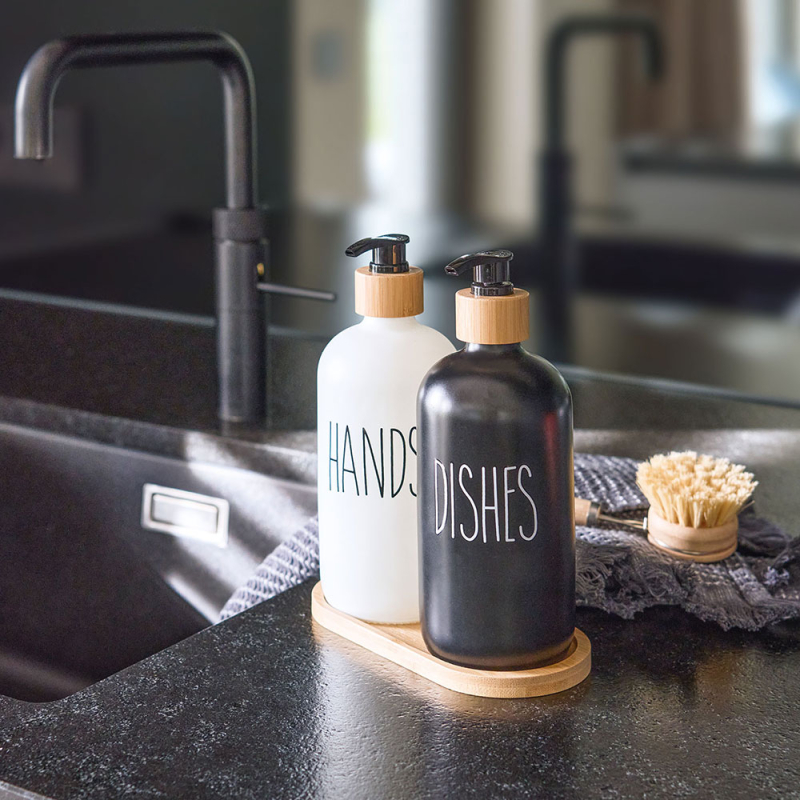Ντισπένσερ υγρού πιάτων και ντισπένσερ κρεμοσάπουνου με βάση σε μοντέρνο ύφος. Τα δοχεία είναι κατασκευασμένα από γυαλί σε μαύρο και λευκό χρώμα με μπεζ λεπτομέρειες από ξύλο bamboo. Διαθέτει βάση από ξύλο bamboo σε μπεζ χρώμα που μπορεί να χρησιμοποιηθεί και για να ακουμπάτε το σφουγγάρι σας. Ιδανικό για τον πάγκο της κουζίνας σας. Χωρητικότητα ανά δοχείο: 300ml. Με πιστοποίηση FSC 100% SCS-COC-000256.