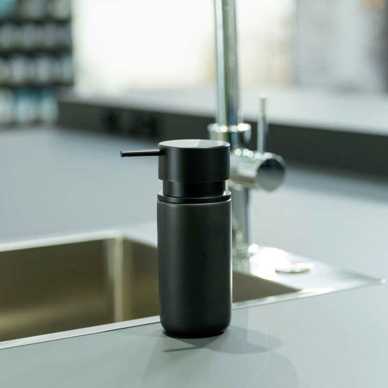 Ντισπένσερ υγρού πιάτων από την γερμανική εταιρεία Wenko. Είναι κατασκευασμένο από κεραμικό υλικό σε μαύρο ματ χρώμα. Η διαδικασία είναι απλή, ξεβιδώστε απλώς το δοχείο από τη συσκευή και γεμίστε το με σαπούνι. Χωρητικότητα 250ml.