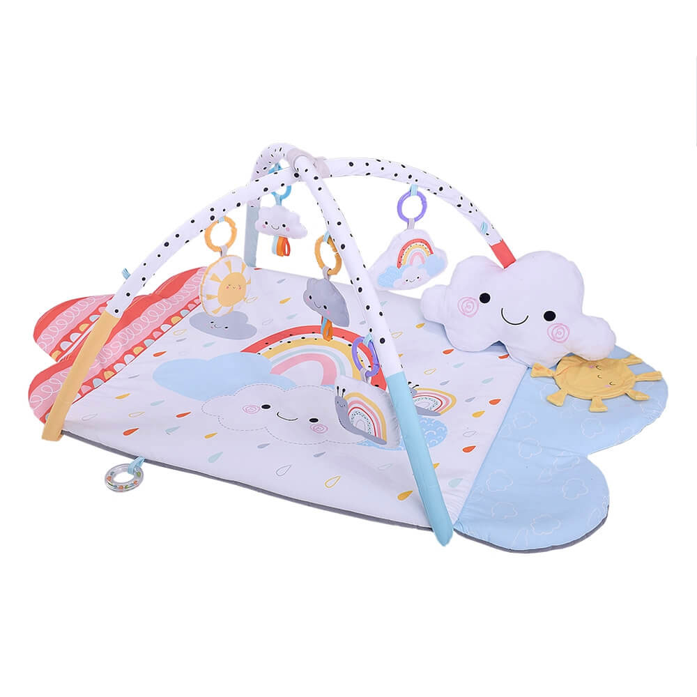 Εκπαιδευτικό γυμναστήριο σε πολύχρωμες αποχρώσεις από την εταιρία Bebe Stars, κατάλληλο από την γέννηση. Τα μοναδικά χαρακτηριστικά του θα βοηθήσουν το μωρό σας να αναπτύξει τις αισθήσεις του και τις κινητικές του ικανότητες. Με έντονα χρώματα που τραβούν την προσοχή και εξάπτουν την περιέργεια του. Έχει 6 κρεμαστά παιχνίδια δραστηριοτήτων-κουδουνίστρες και μαλακό μαξιλαράκι σε σχήμα σύννεφου. Το μεγάλο μέγεθός του προσφέρει άνεση και εξασφαλίζει την μακροχρόνια χρήση του. Έχει πλούσια επένδυση για να είναι μαλακό και αδιάροχό εξωτερικό ύφασμα εξωτερικά για να το καθαρίζετε εύκολα. Εγκεκριμένο σύμφωνα με τα νέα Ευρωπαϊκά Στάνταρντ Ασφαλείας EN 71 και πιστοποίηση CΕ από 100% ασφαλή υλικά.