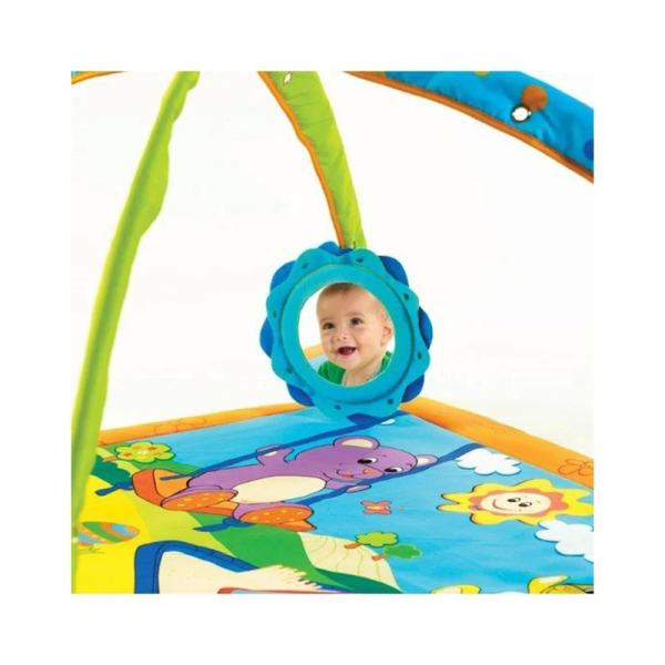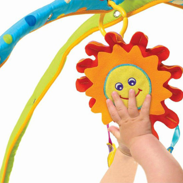 Τα χρώματα, οι υφές και οι ήχοι του γυμναστηρίου διεγείρουν τις αισθήσεις του μωρού από τις πρώτες μέρες. Ενώ βρίσκονται ξαπλωμένο στην στην πλάτη του, αφήστε το να ασκήσει το συντονισμό των χεριών-οφθαλμών 0- 3+ μήνες.