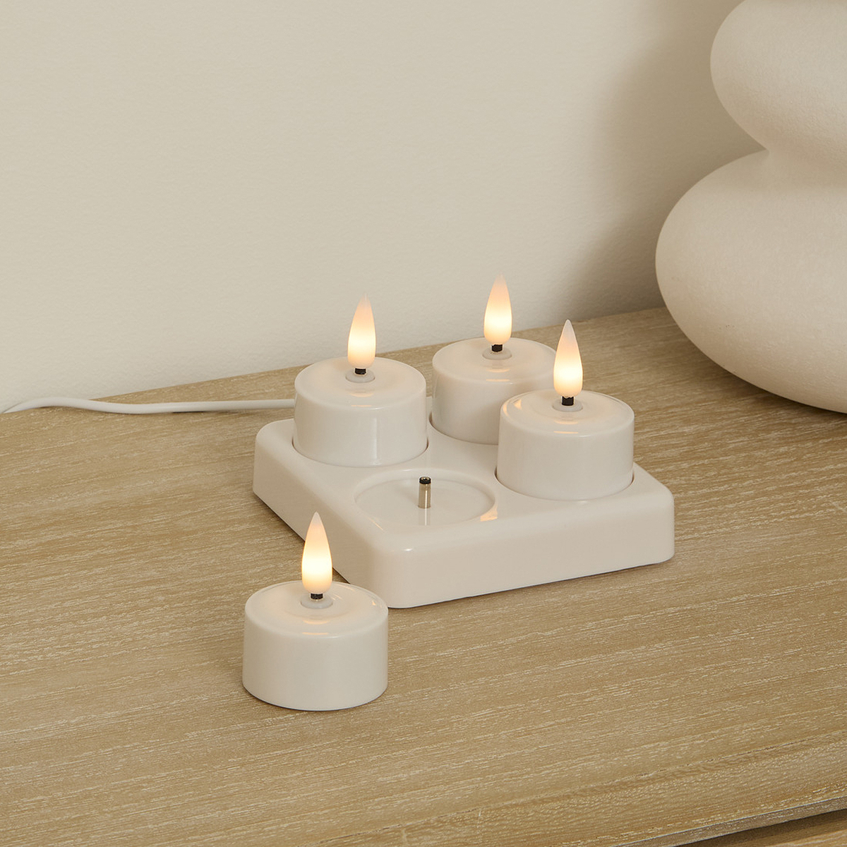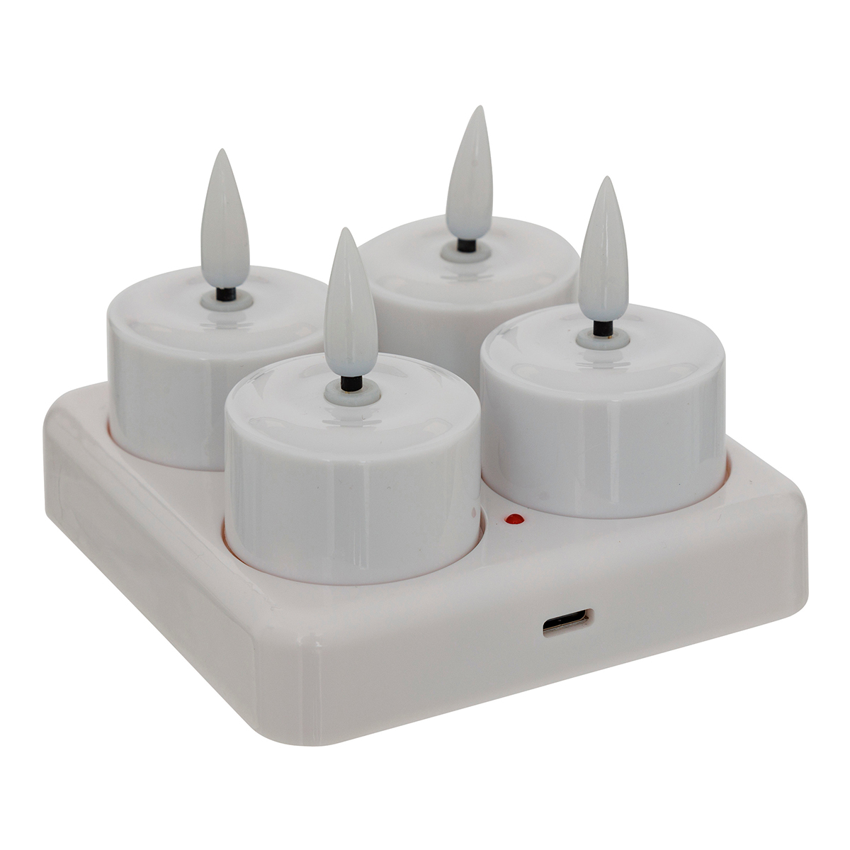 Επαναφορτιζόμενα κεριά ρεσώ με Led. Είναι κατασκευασμένα από πλαστικό υλικό σε λευκό χρώμα. Το σετ περιλαμβάνει 4 ρεσώ με θερμό λευκό φωτισμό που προσομοιάζει το φως κεριού και μια βάση φόρτισης με καλώδιο USB και αντάπτορα. Ιδανικά για να τοποθετήσετε σε όλα τα μέρη του σπιτιού και να λειτουργούν για ώρες χωρίς το άγχος του αληθινού κεριού. Συνδυάστε τα με άλλα διακοσμητικά για να δημιουργήσετε την ατμόσφαιρα που επιθυμείτε.