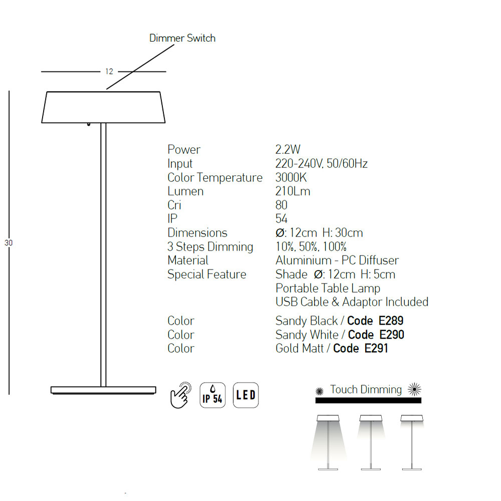 Επαναφορτιζόμενο πορτατίφ από την εταιρεία Zambelis με μίνιμαλ σχεδιασμό. Είναι κατασκευασμένο από αλουμίνιο σε μαύρο ματ χρώμα. Έχει βαθμό στεγανότητας IP54, που το καθιστά κατάλληλο για τοποθέτηση και σε εξωτερικό χώρο. Έχει την δυνατότητα αυξομείωσης του φωτισμού, με ένταση 10%, 50% και 100%. Φορτίζει με καλώδιο USB και αντάπτορα που περιλαμβάνονται. Διαθέτει ενσωματωμένη πλακέτα Led με ισχύ 2.2W, θερμού λευκού φωτισμού 3000K και φωτεινότητας 210Lm. Μπορείτε να το τοποθετήσετε σε όποιο χώρο του σπιτιού σας επιθυμείτε ακόμα και στον κήπο ή την βεράντα σας και είναι εξαιρετική επιλογή για επαγγελματικούς χώρους & εστιατόρια. Εγγύηση 2 χρόνια. Μετά το πέρας της εγγύησης, ενδεχόμενες επισκευές πραγματοποιούνται κατόπιν επικοινωνίας με τo Spitishop. Tο προϊόν θα αποσταλεί στον επίσημο προμηθευτή, ο οποίος καθορίζει και το κόστος επισκευής. Τάση: 220-240Volt.