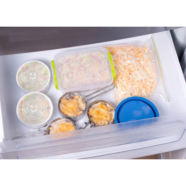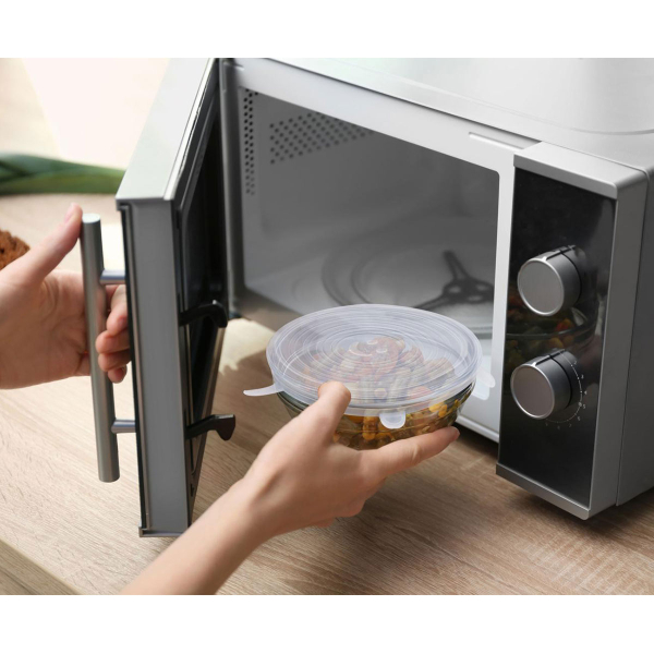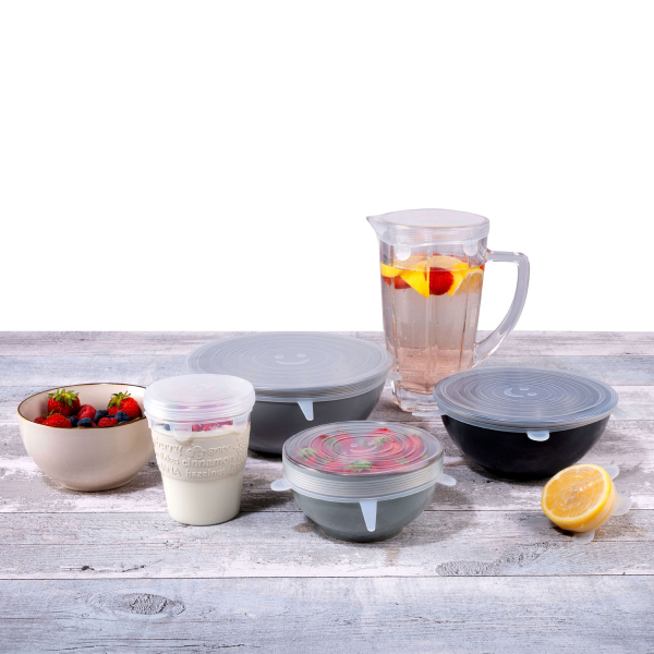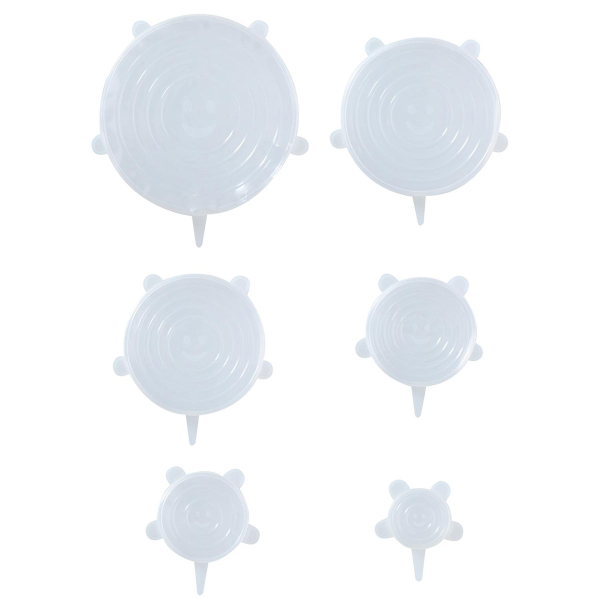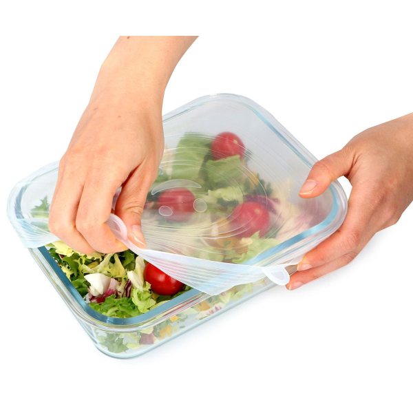 Επαναχρησιμοποιούμενες μεμβράνες φαγητού σε σετ 6 τεμαχίων. Είναι κατασκευασμένες από σιλικόνη ενώ έχουν την δυνατότητα να προσαρμόζονται σε οποιοδήποτε μέγεθος δοχείων ή πιάτων φαγητού χάρη στην ευλυγισία τους. Απλώς τεντώνετε την μεμβράνη στο δοχείο ή στο πιάτο με το φαγητό που θέλετε να προστατεύσετε. Είναι πρακτικές και εύχρηστες, προστατεύουν τα τρόφιμα σας και λειτουργούν σαν καπάκι αλλά επιπλέον είναι και οικολογικές καθώς μπορείτε να τις πλένετε και να επαναχρησιμοποιείτε.