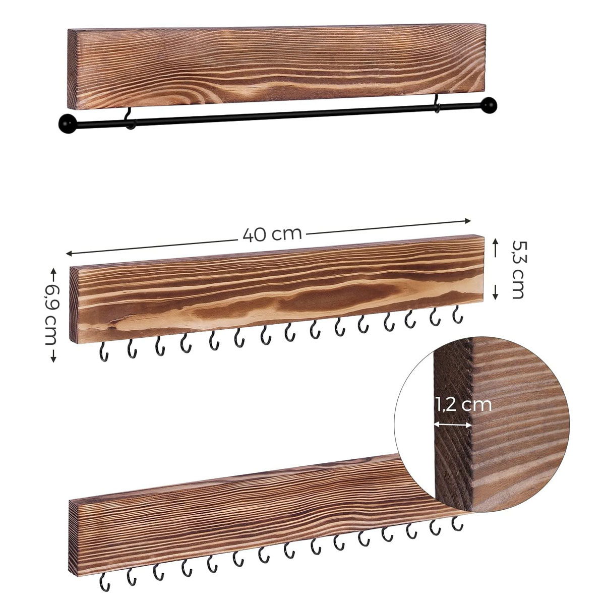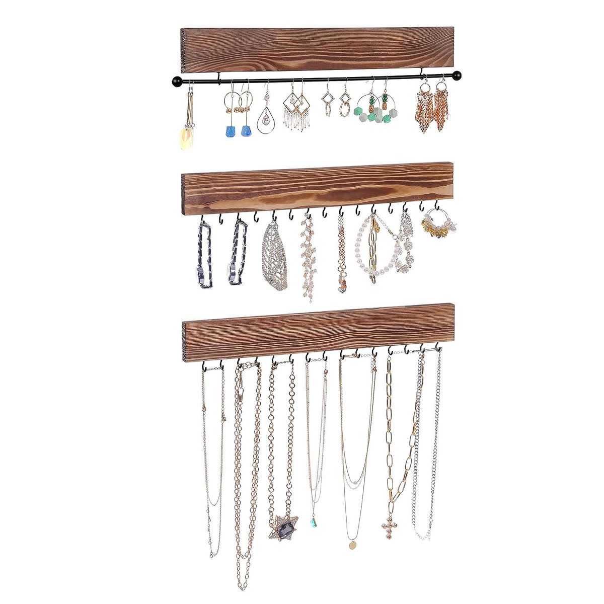 Επιτοίχιες κρεμάστρες κοσμημάτων σε σετ 3 τεμαχίων από την εταιρεία Songmics. Είναι κατασκευασμένες από ξύλο πεύκου σε καφέ χρώμα και μαύρο μεταλλικό υλικό. Διαθέτουν κρεμαστράκια για να κρεμάτε κολιέ, σκουλαρίκια και δαχτυλίδια. Ιδανικές μπιζουτιέρες που θα διακοσμήσουν υπέροχα το χώρο σας, ενώ παράλληλα αποτελούν ένα βολικό τρόπο αποθήκευσης των κοσμημάτων σας.