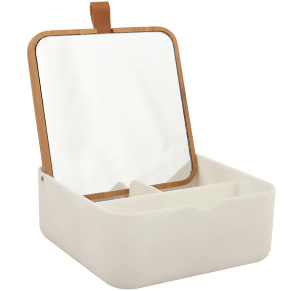 Θήκη για καλλυντικά, κοσμήματα και αξεσουάρ. Kατασκευασμένο από πλαστικό σε λευκό χρώμα και έχει στοιχεία από μπαμπού σε φυσική απόχρωση. Διαθέτει καθρέφτη που είναι στο καπάκι και μπορεί να σταθεί στην ειδική υποδοχή και λουράκι για εύκολο άνοιγμα. Έχει 3 χωρίσματα για ευκολότερη οργάνωση. Είναι κατασκευασμένο από 100% bamboo σε μαύρη και μπεζ απόχρωση. Ιδανικό για να διατηρείτε πάντα οργανωμένα τα αντικείμενά σας.