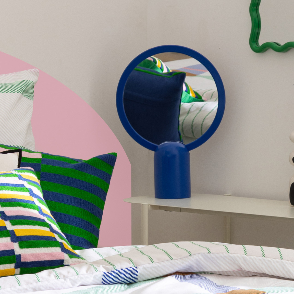 Επιτραπέζιος καθρέφτης με μοντέρνα αισθητική. Είναι κατασκευασμένος από ξύλο MDF_E1 σε μπλε χρώμα. Ιδανικός καθρέφτης για να τοποθετηθεί στο μπάνιο ή στο μπουντουάρ για το μακιγιάζ σας. Μπορεί να τοποθετηθεί ακόμα στο σαλόνι σαν διακοσμητικό χώρου.