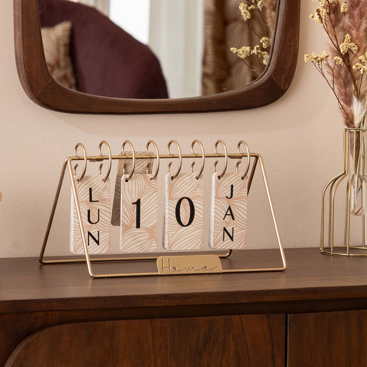 Επιτραπέζιο ημερολόγιο με μοντέρνο σχεδιασμό. Είναι κατασκευασμένο από μεταλλικό υλικό σε χρυσό και μπεζ χρώμα. Απλά γυρίζετε τις καρτέλες μέχρι να φτάσετε στην επιθυμητή ημερομηνία. Ιδανικό σαν χρηστικό αλλά και διακοσμητικό αντικείμενο στο χώρο σας. Συνδυάστε το με τα υπόλοιπα είδη της ίδιας συλλογής για ένα ολοκληρωμένο αποτέλεσμα στο χώρο σας.