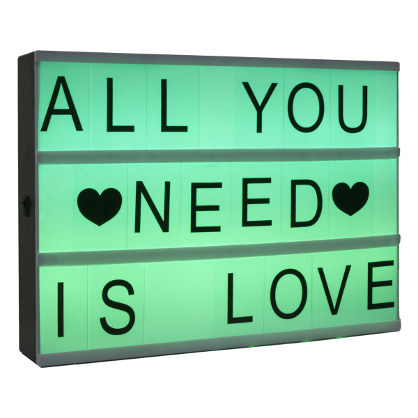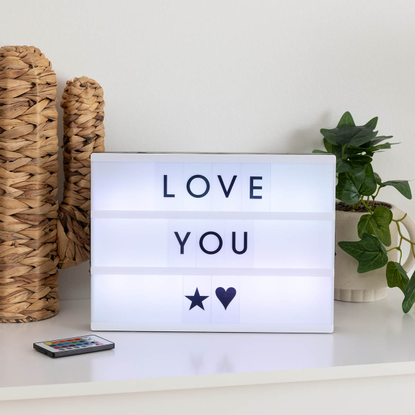 Διακοσμητικό φωτιστικό τύπου Lightbox για να γράψετε το μήνυμα σας! Είναι κατασκευασμένο από πλαστικό υλικό σε λευκή απόχρωση με μαύρες λεπτομέρειες. Περιλαμβάνει 82 γράμματα του αγγλικού αλφαβήτου και σύμβολα και τηλεχειριστήριο για να αλλάζει χρώματα. Λειτουργεί με 6 μπαταρίες AA LR6, οι οποίες δεν περιλαμβάνονται.