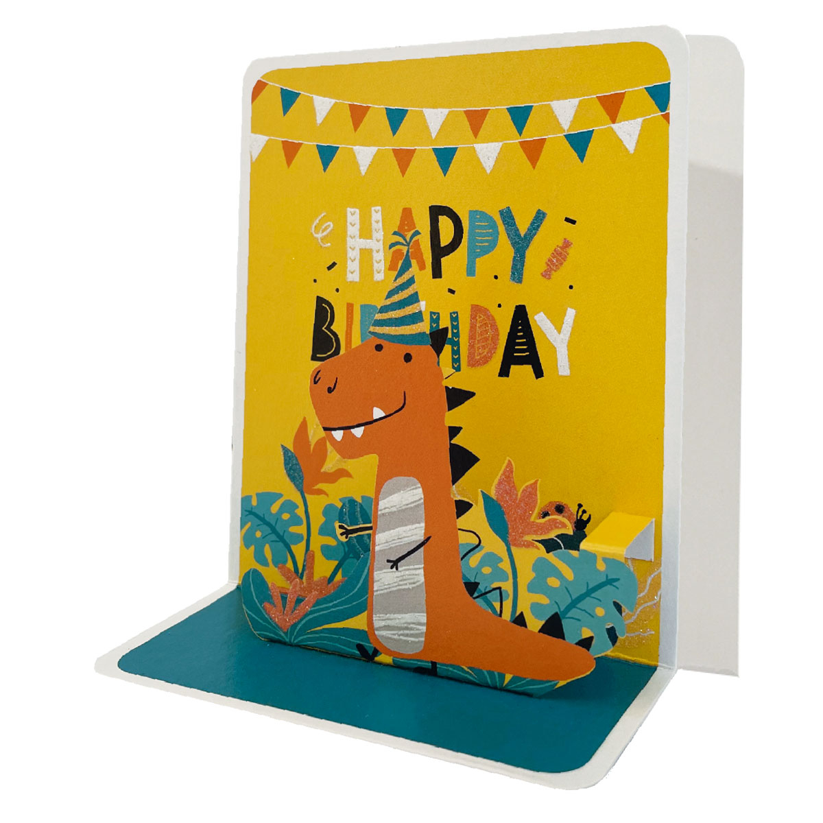 Ευχετήρια κάρτα γενεθλίων από την εταιρεία Pictura. Έχει κίτρινο χρώμα με πολύχρωμες λεπτομέρειες και δεινόσαυρο στο σχέδιο. Σε κάποια σημεία έχει διάφανο βερνίκι UV υψηλής γυαλάδας. Είναι 3D, δηλαδή είναι διπλή κάρτα που στην μπροστινή όψη έχει τρισδιάστατο σχέδιο και εσωτερικά έχει χώρο για χειρόγραφες ευχές. Περιλαμβάνει φάκελο. Ιδανική κάρτα για να δώσετε στο αγαπημένο σας πρόσωπο.
