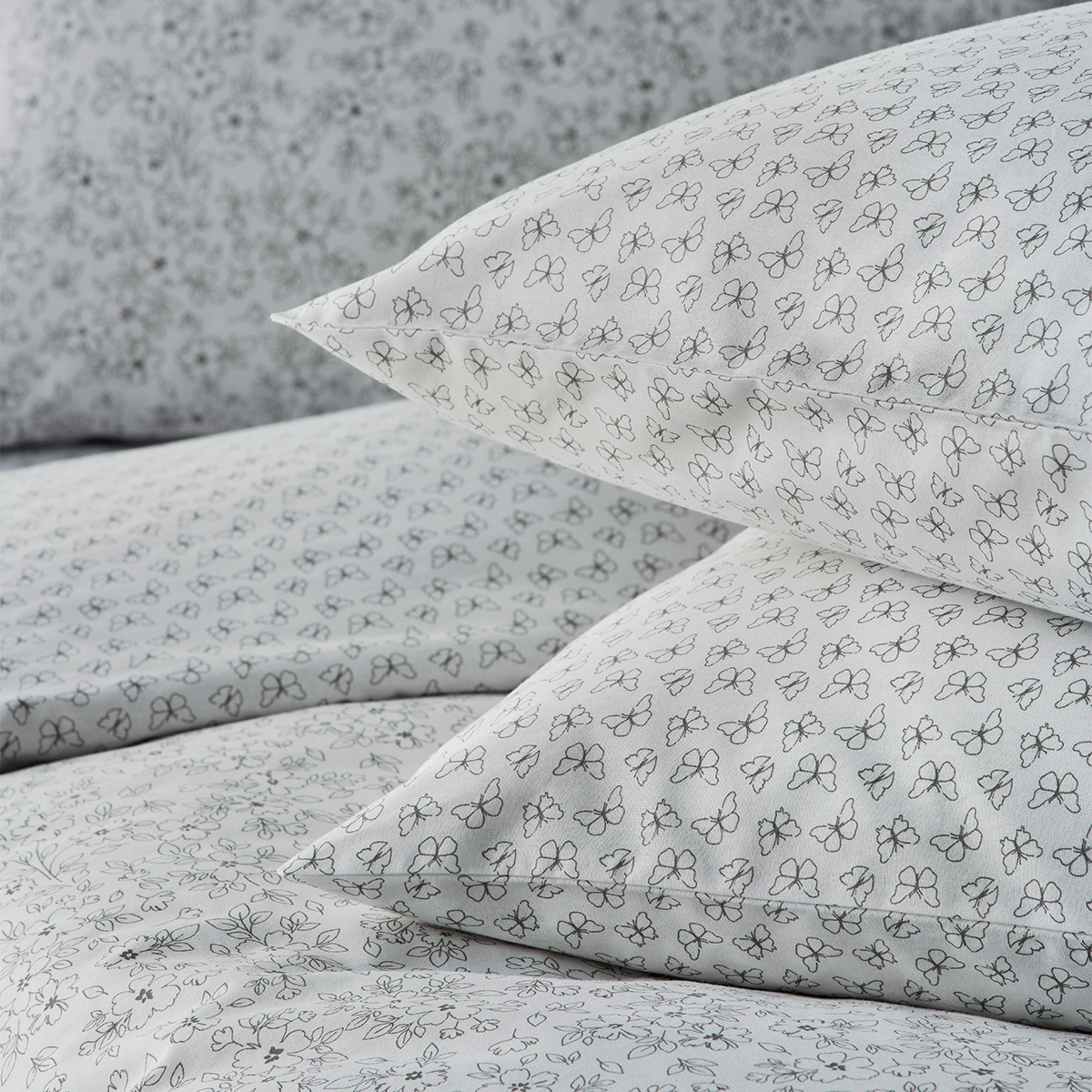 Ζεύγος μαξιλαροθήκες από την εταιρεία Kentia, σε γκρι χρώμα με μοτίβο με πεταλούδες. Το ύφασμα είναι κατασκευασμένο από 100% βαμβάκι 150 κλωστών με απαλή υφή. Διαθέτουν το σχέδιο του κατωσέντονου.