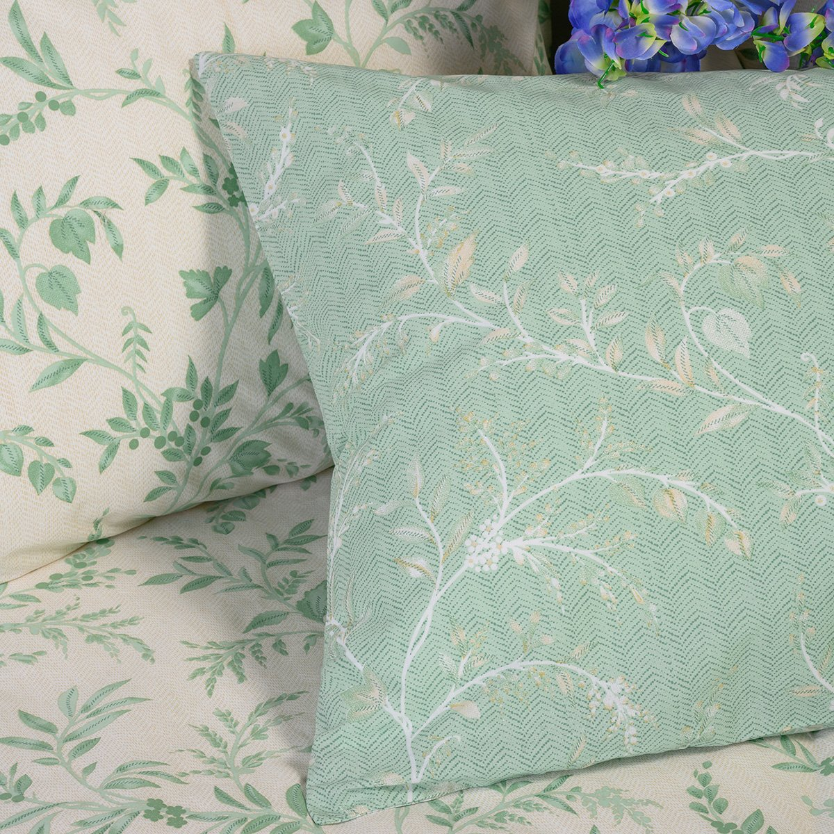Ζεύγος μαξιλαροθήκες σε βεραμάν χρώμα, με λευκές λεπτομέρειες και φλοράλ σχέδιο από την εταιρεία Melinen. Είναι κατασκευασμένες από 50% βαμβάκι 50% polyester 144 κλωστών που τις καθιστά απαλές και ανθεκτικές. Συνδυάστε τες με τα υπόλοιπα είδη της ίδιας σειράς για ένα ολοκληρωμένο αποτέλεσμα.