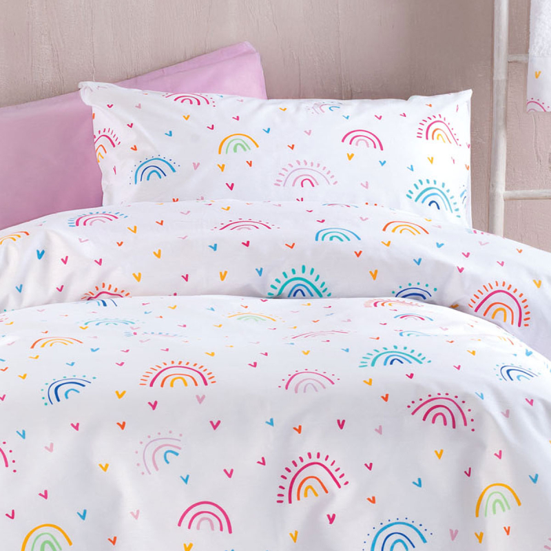 Ζεύγος μαξιλαροθήκες φάκελος σε λευκό χρώμα, με πολύχρωμες λεπτομέρειες και σχέδιο ουράνιο τόξο από την εταιρεία Rythmos. Η ποιότητά τους από 100% βαμβάκι 144 κλωστών τις καθιστά ανθεκτικές και απαλές. Συνδυάστε τες με τα υπόλοιπα είδη της ίδιας σειράς για ένα ολοκληρωμένο αποτέλεσμα.