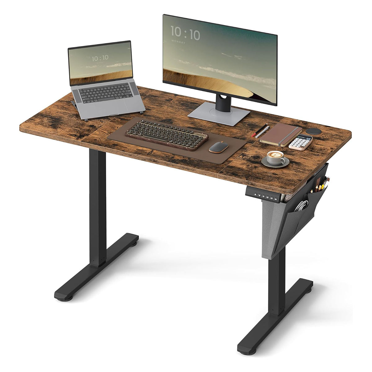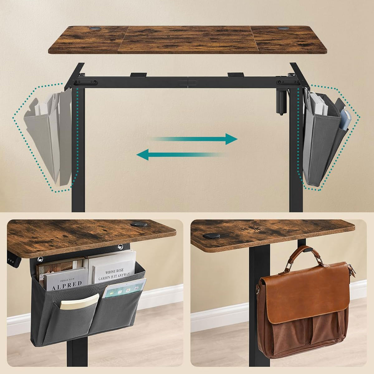 Ηλεκτρικό γραφείο με ρυθμιζόμενο ύψος από την εταιρεία Songmics. Είναι κατασκευασμένο από μοριοσανίδα σε καφέ χρώμα με μαύρο μεταλλικό σκελετό. Διαθέτει led οθόνη που αναγράφει το ύψος που βρίσκεται την προκειμένη στιγμή το γραφείο και αποθηκευτική μνήμη για 4 διαφορετικά ύψη. Βάζετε το γραφείο στο επιθυμητό ύψος, το αποθηκεύετε σε 1 από τις 4 θέσεις και με το πάτημα του συγκεκριμένου κουμπιού το γραφείο αυτόματα πηγαίνει στο αποθηκευμένο ύψος. Με αυτό τον τρόπο σας δίνει την δυνατότητα να δουλέψετε στο γραφείο όρθιοι. Διαθέτει γάντζο για να κρεμάτε τα ακουστικά ή τη τσάντα σας και θήκη για να αποθηκεύετε μικροπράγματα. Περιλαμβάνεται και ένας υφασμάτινος οργανωτής, που τοποθετείται στο πλάι του γραφείου, για χαρτιά και μικροπράγματα. Τα πόδια του γραφείου έχουν τάπες για να μην φθείρουν το πάτωμα. Η επιφάνεια έχει 2 οπές για να περνάνε τα καλώδια. Ιδανικό γραφείο για το σπίτι ή τον εργασιακό χώρο καθώς έχει αθόρυβη λειτουργία <50 dB. Το καλώδιο έχει μήκος 190εκ. Μέγιστο βάρος αντοχής επιφάνειας: 70kg. *Το προϊόν έρχεται αμοντάριστο και συναρμολογείται βάσει οδηγιών.*