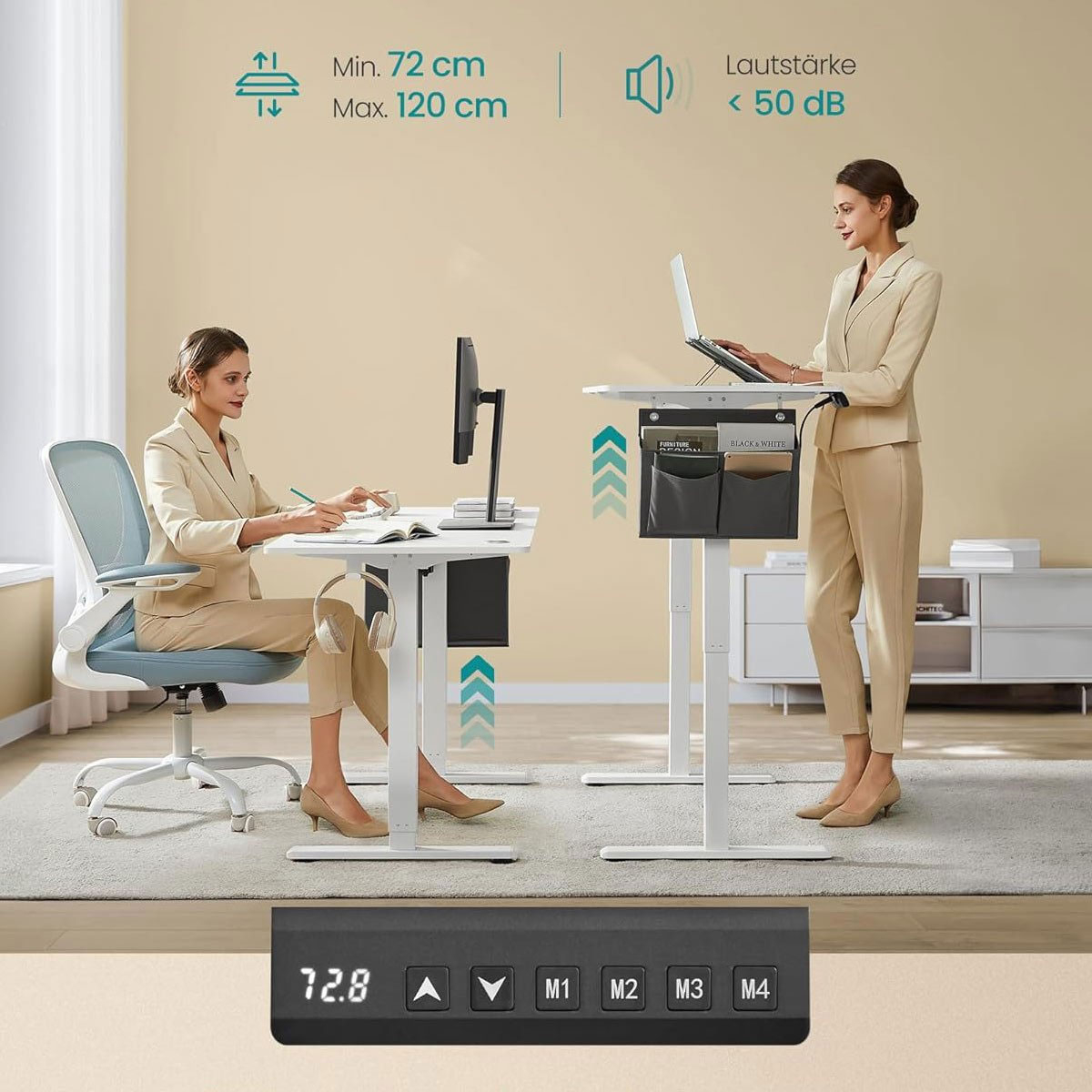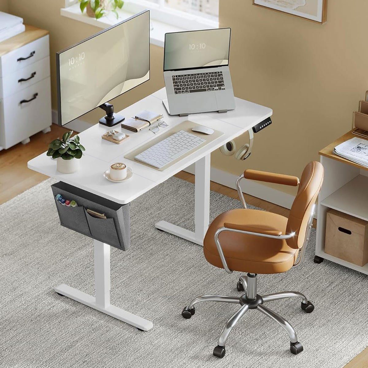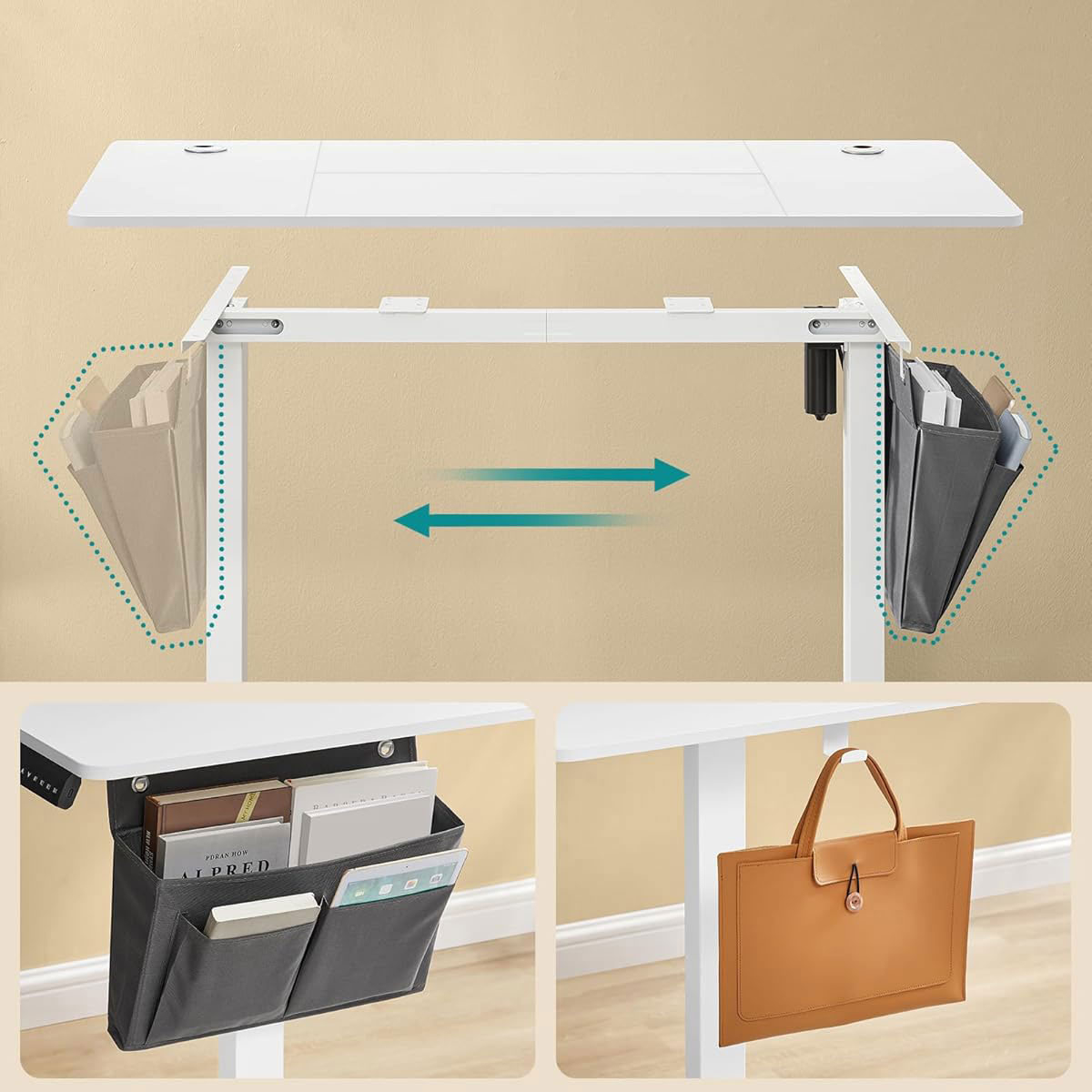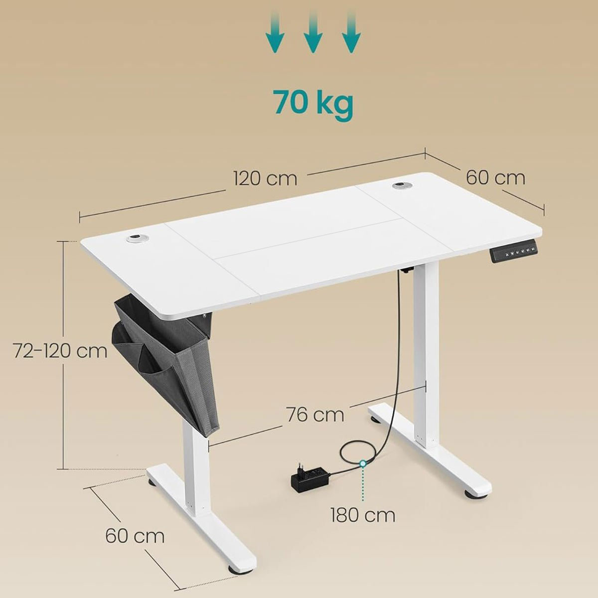 Ηλεκτρικό γραφείο με ρυθμιζόμενο ύψος από την εταιρεία Songmics. Είναι κατασκευασμένο από μοριοσανίδα σε λευκό χρώμα με λευκό μεταλλικό σκελετό. Διαθέτει led οθόνη που αναγράφει το ύψος που βρίσκεται την προκειμένη στιγμή το γραφείο και αποθηκευτική μνήμη για 4 διαφορετικά ύψη. Βάζετε το γραφείο στο επιθυμητό ύψος, το αποθηκεύετε σε 1 από τις 4 θέσεις και με το πάτημα του συγκεκριμένου κουμπιού το γραφείο αυτόματα πηγαίνει στο αποθηκευμένο ύψος. Με αυτό τον τρόπο σας δίνει την δυνατότητα να δουλέψετε στο γραφείο όρθιοι. Διαθέτει γάντζο για να κρεμάτε τα ακουστικά ή τη τσάντα σας και θήκη για να αποθηκεύετε μικροπράγματα. Περιλαμβάνεται και ένας υφασμάτινος οργανωτής, που τοποθετείται στο πλάι του γραφείου, για χαρτιά και μικροπράγματα. Τα πόδια του γραφείου έχουν τάπες για να μην φθείρουν το πάτωμα. Η επιφάνεια έχει 2 οπές για να περνάνε τα καλώδια. Ιδανικό γραφείο για το σπίτι ή τον εργασιακό χώρο καθώς έχει αθόρυβη λειτουργία <50 dB. Το καλώδιο έχει μήκος 190εκ. Μέγιστο βάρος αντοχής επιφάνειας: 70kg. *Το προϊόν έρχεται αμοντάριστο και συναρμολογείται βάσει οδηγιών.*