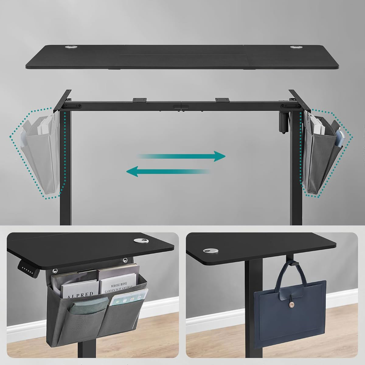 Ηλεκτρικό γραφείο με ρυθμιζόμενο ύψος από την εταιρεία Songmics. Είναι κατασκευασμένο από μοριοσανίδα σε μαύρο χρώμα με μαύρο μεταλλικό σκελετό. Διαθέτει led οθόνη που αναγράφει το ύψος που βρίσκεται την προκειμένη στιγμή το γραφείο και αποθηκευτική μνήμη για 4 διαφορετικά ύψη. Βάζετε το γραφείο στο επιθυμητό ύψος, το αποθηκεύετε σε 1 από τις 4 θέσεις και με το πάτημα του συγκεκριμένου κουμπιού το γραφείο αυτόματα πηγαίνει στο αποθηκευμένο ύψος. Με αυτό τον τρόπο σας δίνει την δυνατότητα να δουλέψετε στο γραφείο όρθιοι. Διαθέτει γάντζο για να κρεμάτε τα ακουστικά ή τη τσάντα σας και θήκη για να αποθηκεύετε μικροπράγματα. Περιλαμβάνεται και ένας υφασμάτινος οργανωτής, που τοποθετείται στο πλάι του γραφείου, για χαρτιά και μικροπράγματα. Τα πόδια του γραφείου έχουν τάπες για να μην φθείρουν το πάτωμα. Η επιφάνεια έχει 2 οπές για να περνάνε τα καλώδια. Ιδανικό γραφείο για το σπίτι ή τον εργασιακό χώρο καθώς έχει αθόρυβη λειτουργία <50 dB. Το καλώδιο έχει μήκος 190εκ. Μέγιστο βάρος αντοχής επιφάνειας: 70kg. *Το προϊόν έρχεται αμοντάριστο και συναρμολογείται βάσει οδηγιών.*