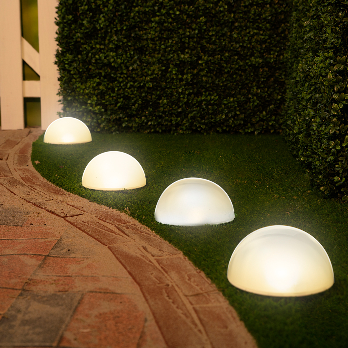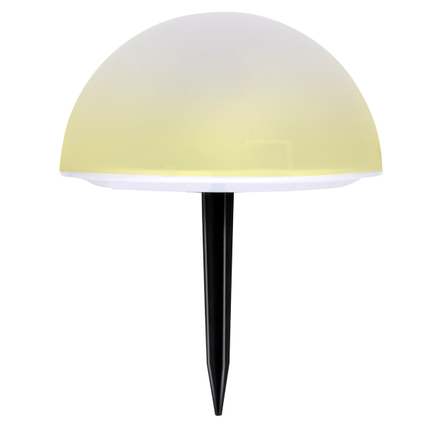 Ηλιακά φωτιστικά καρφωτά εξωτερικού χώρου από την εταιρεία Grundig. Είναι κατασκευασμένα από πλαστικό υλικό σε λευκό χρώμα με σχήμα ημισφαίριου και είναι συνδεδεμένα με καλώδιο. Το σετ περιλαμβάνει 5 τεμάχια ίδιου μεγέθους που διαθέτουν ηλιακό πάνελ στο τέλος του καλωδίου. Το μήκος του καλωδίου είναι 8 μέτρα. Μπορούν να τοποθετηθούν στον κήπο ή την αυλή μέσα στο χώμα. Έχουν από 1 λάμπα led με θερμό λευκό και έχουν τη δυνατότητα εναλλαγής χρώματος RGB με πολύχρωμο φως. Τροφοδοτούνται από μία μπαταρία, που περιλαμβάνεται, με χωρητικότητα 600mAh. Κατά τη διάρκεια της ημέρας, η ηλιακή ενέργεια επαναφορτίζει την εσωτερική μπαταρία μέσω του ενσωματωμένου πάνελ και το βράδυ ανάβει αυτόματα. Διαθέτει διακόπτη On/Off. Μετά από πλήρη φόρτιση έχει αυτονομία 6-8 ωρών. Το μοντέρνο στυλ τους θα διακοσμήσει και θα φωτίσει τον κήπο και τους εξωτερικούς χώρους του σπιτιού ή του εξοχικού σας.
