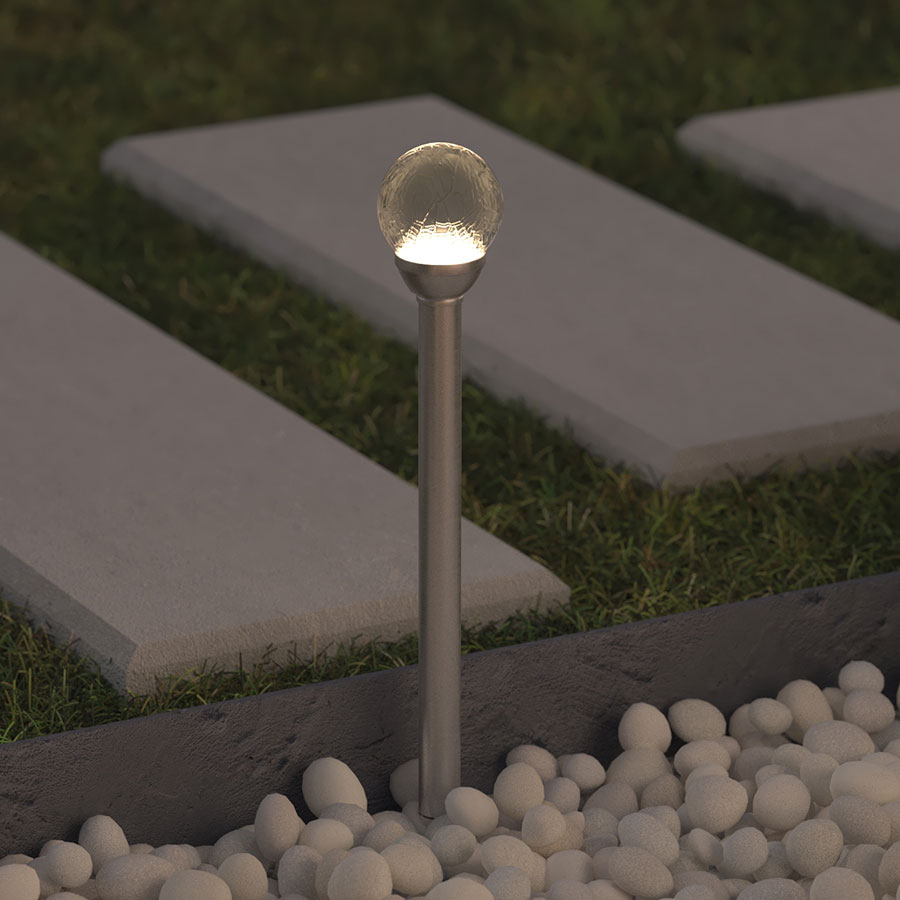 Ηλιακό φωτιστικό κολωνάκι εξωτερικού χώρου με βαθμό στεγανότητας IP44. Είναι κατασκευασμένο από ανοξείδωτο ατσάλι σε ασημί απόχρωση και διάφανο πλαστικό υλικό. Μπορεί να τοποθετηθεί στον κήπο, την αυλή ή την βεράντα μέσα στο χώμα. Έχει 1 λάμπα led με ψυχρό λευκό φως. Τροφοδοτείται από μία επαναφορτιζόμενη AA Ni-MH, που περιλαμβάνεται, με χωρητικότητα 150mAh. Κατά τη διάρκεια της ημέρας, η ηλιακή ενέργεια επαναφορτίζει την εσωτερική μπαταρία μέσω του ενσωματωμένου πάνελ και το βράδυ ανάβει αυτόματα. Μετά από πλήρη φόρτιση έχει αυτονομία 6-8 ωρών. Το μίνιμαλ στυλ του θα διακοσμήσει και θα φωτίσει τον κήπο και τους εξωτερικούς χώρους του σπιτιού ή του εξοχικού σας.