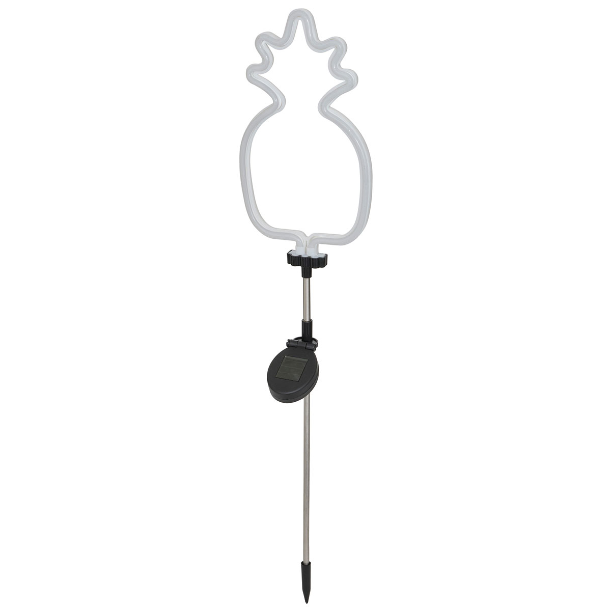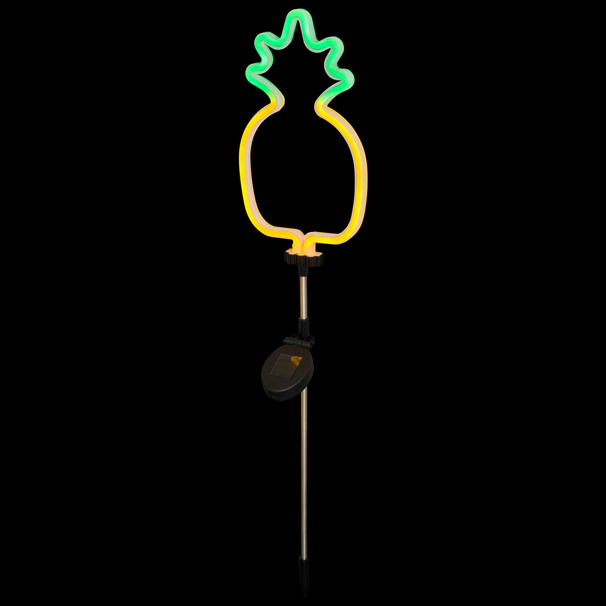Ηλιακό φωτιστικό neon εξωτερικού χώρου σε σχήμα ανανά. Είναι καρφωτό, για να τοποθετείται εύκολα σε χώμα ή γλάστρα. Κατά τη διάρκεια της ημέρας η ηλιακή ενέργεια επαναφορτίζει την εσωτερική μπαταρία μέσω του ενσωματωμένου πάνελ και το βράδυ ανάβει αυτόματα. Μετά από πλήρη φόρτιση έχει αυτονομία 8 ωρών. Έχει βαθμό στεγανότητας IP44. Θα διακοσμήσει με στυλ και θα φωτίσει τον κήπο και τους εξωτερικούς χώρους του σπιτιού ή του εξοχικού σας.