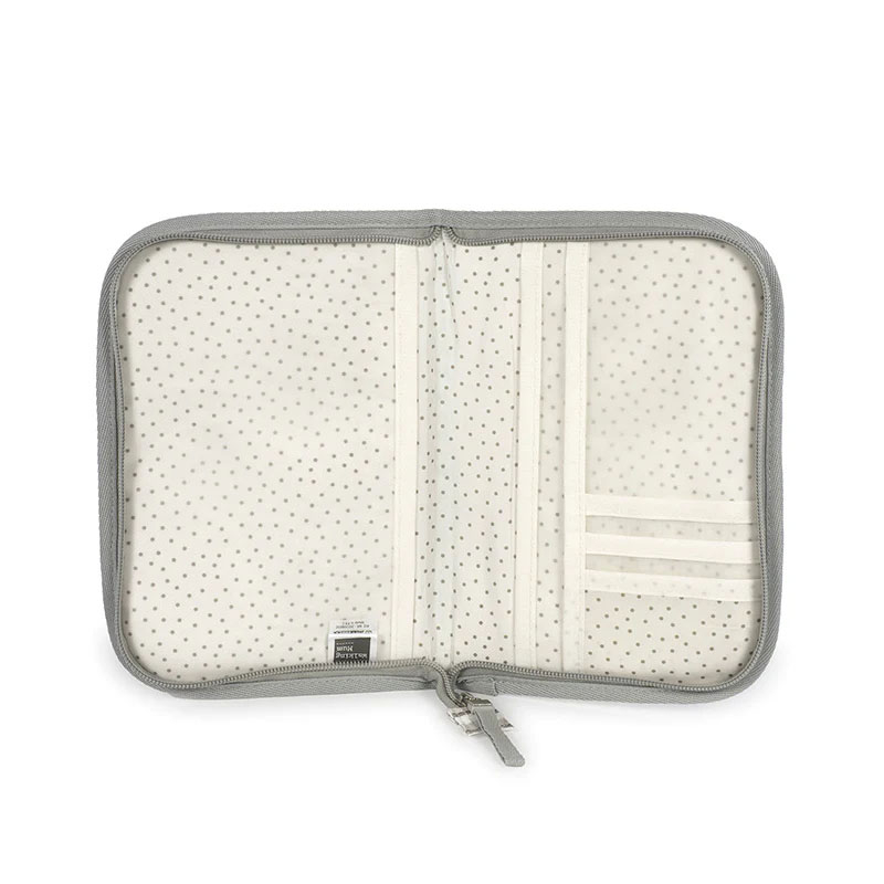 Υφασμάτινη θήκη για το βιβλιάριο υγείας του παιδιού από την εταιρεία Walking Mum σε γκρι χρώμα, με μπεζ λεπτομέρειες και ριγέ σχέδιο. Η σύνθεσή της είναι από 100% πλαστικοποιημένο βαμβάκι που έχει υποστεί ειδική επεξεργασία ώστε να είναι αδιάβροχο. Ως αποτέλεσμα να προστατεύει το βιβλιάριο υγείας από υγρασία. Διαθέτει επιπλέον πλαστικοποιημένες θήκες στο εσωτερικό για την αποθήκευση των καρτών, των συνταγών του γιατρού ή ακόμα επίσημων εγγράφων ώστε να μην χάνετε τίποτα και κλείνει με φερμουάρ.
