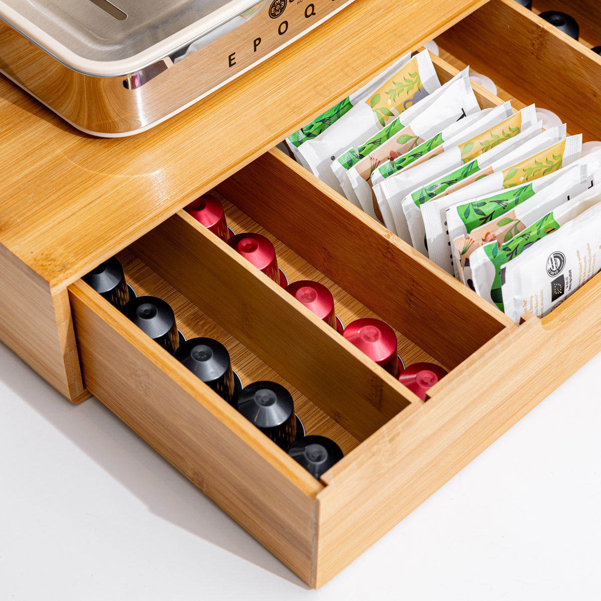 Θήκη για κάψουλες espresso από την εταιρεία εstia. Είναι κατασκευασμένα από bamboo σε φυσική απόχρωση. Διαθέτει 5 ρυθμιζόμενες θέσεις για να είναι συμβατή με όλες τις κάψουλες. Ανάλογα με το μέγεθος της κάψουλας αλλάζει και η χωρητικότητα. Ιδανική θήκη που θα κρατήσει οργανωμένο τον πάγκο σας.