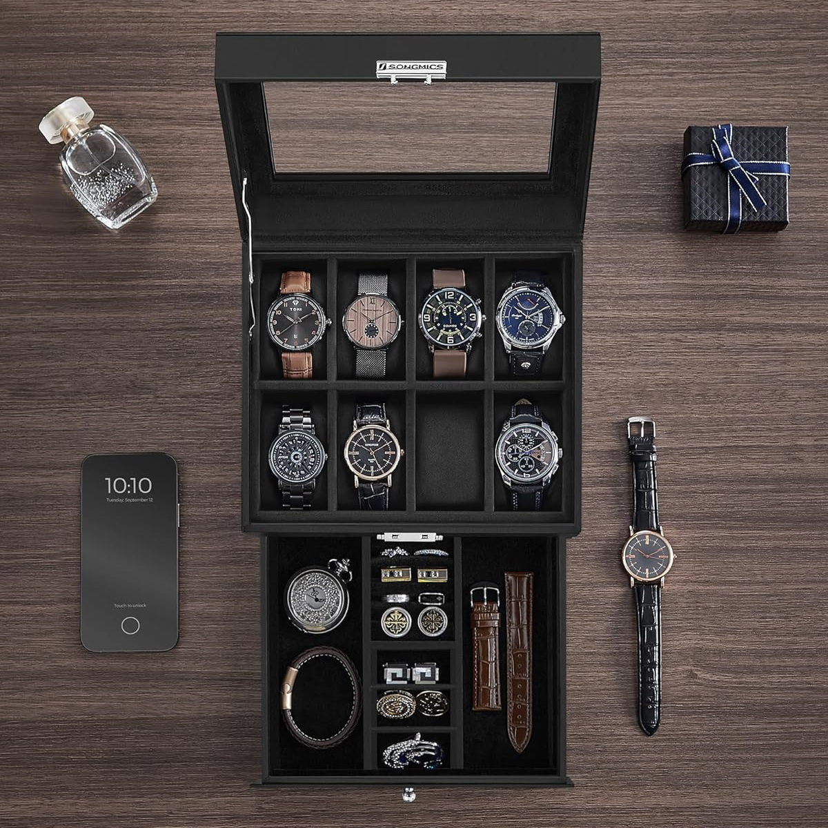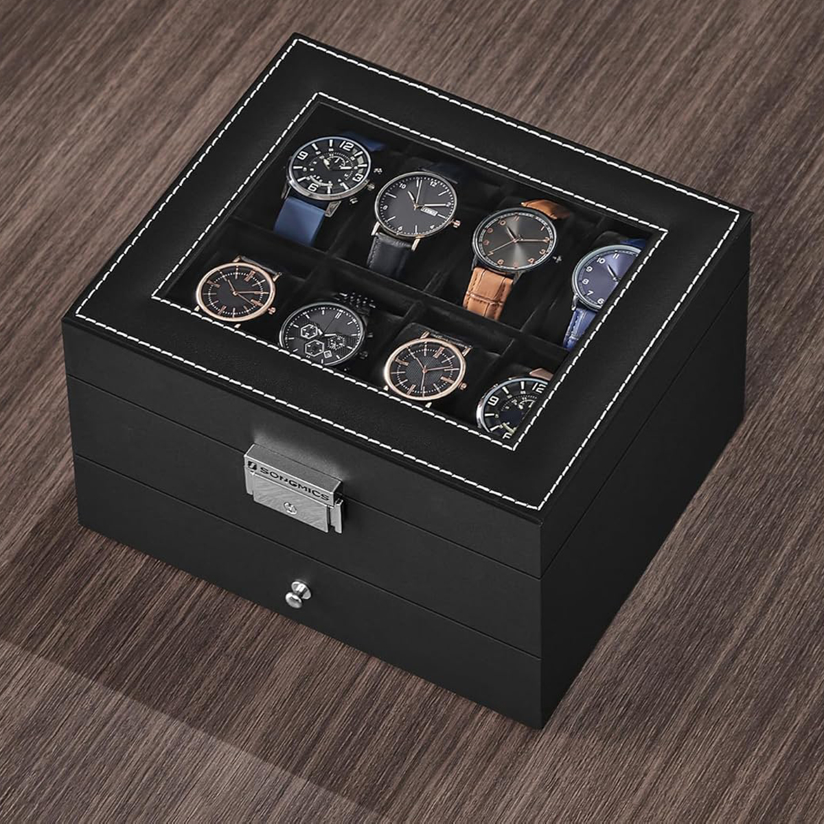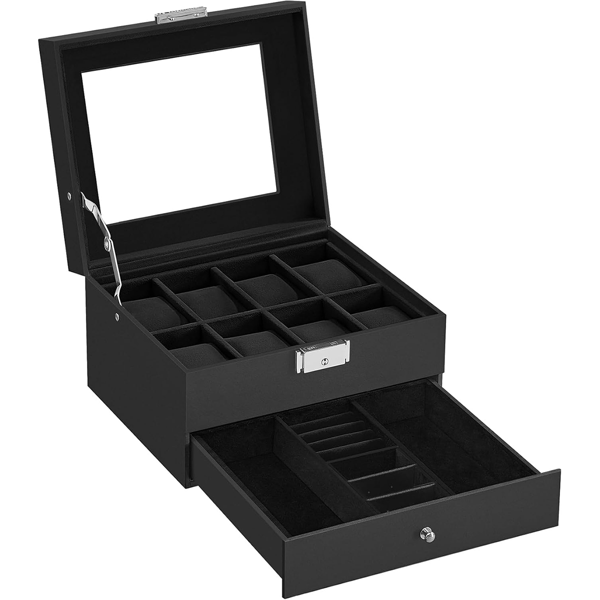 Θήκη ρολογιών με συρτάρι για κοσμήματα από την εταιρεία Songmics. Ο σκελετός είναι κατασκευασμένος από ξύλο MDF και διαθέτει επένδυση από δερματίνη σε μαύρο χρώμα. Εσωτερικά έχει χωρίσματα που δημιουργούν χώρους για 8 ρολόγια με επένδυση από μαύρο βελούδινο ύφασμα. Διαθέτει συρτάρι με 2 χώρους για κοσμήματα και 1 χώρο για δαχτυλίδια. Η θήκη είναι ανοιγόμενη και σφραγίζει με κλιπ και κλειδί για μεγαλύτερη ασφάλεια. Το καπάκι είναι γυάλινο και σας επιτρέπει να βλέπετε στο εσωτερικό της θήκης. Πολύ κομψή θήκη ρολογιών - μπιζουτιέρα και πρωτότυπη πρόταση δώρου για άντρες και γυναίκες.