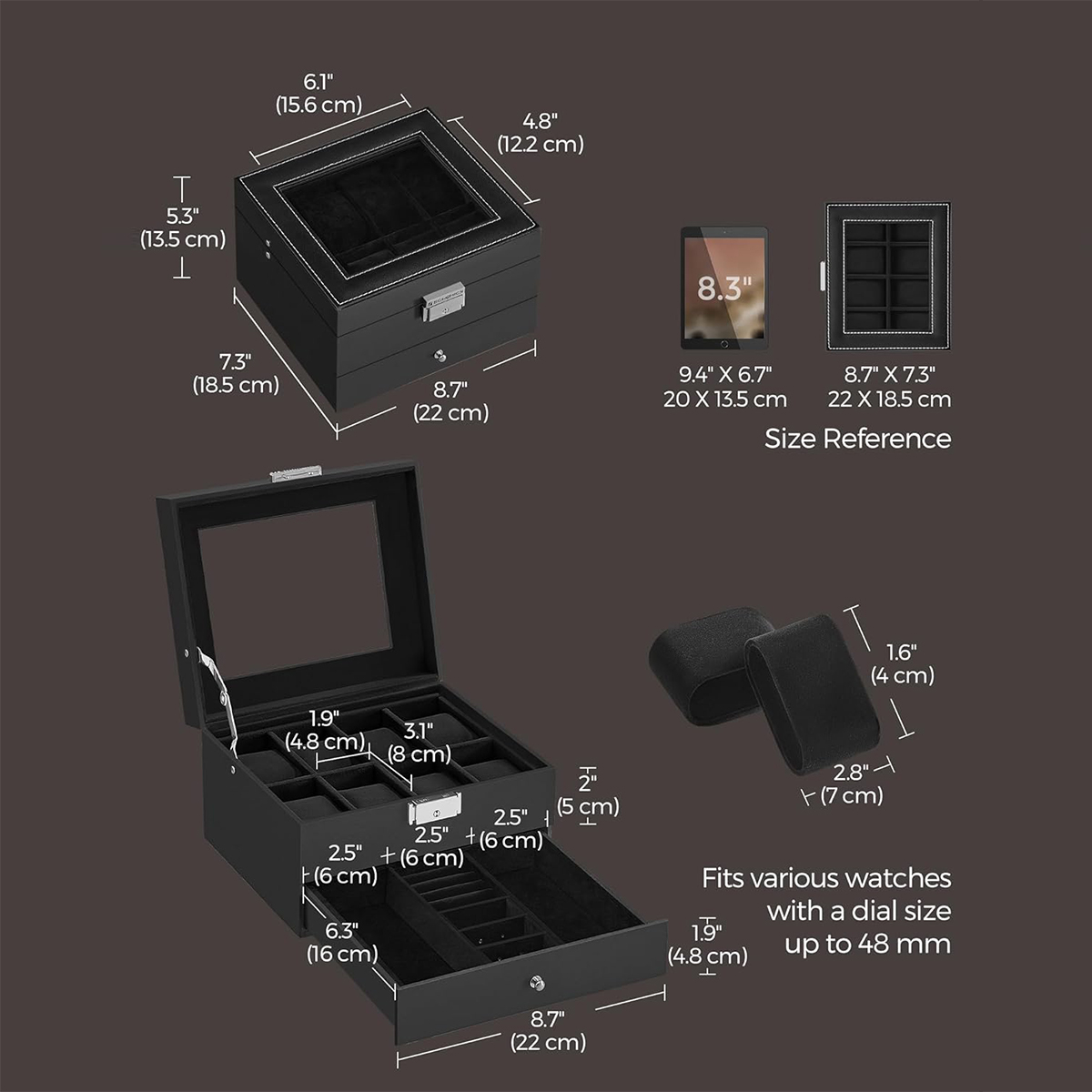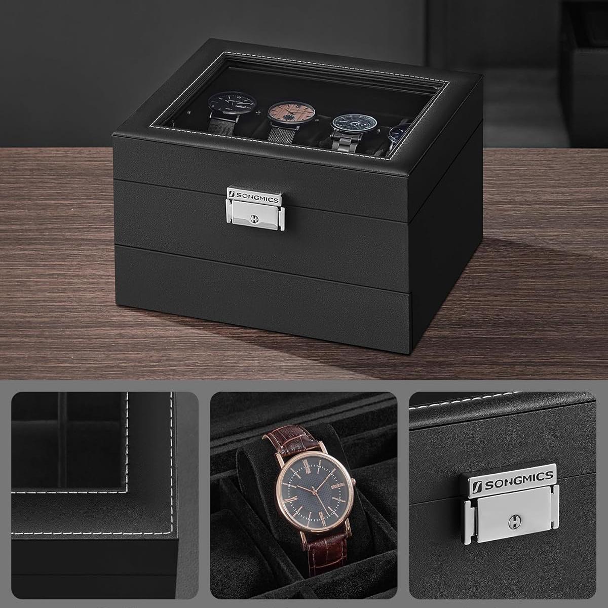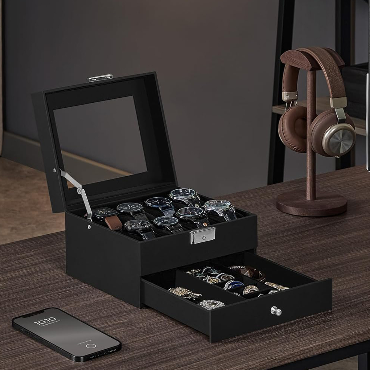Θήκη ρολογιών με συρτάρι για κοσμήματα από την εταιρεία Songmics. Ο σκελετός είναι κατασκευασμένος από ξύλο MDF και διαθέτει επένδυση από δερματίνη σε μαύρο χρώμα. Εσωτερικά έχει χωρίσματα που δημιουργούν χώρους για 8 ρολόγια με επένδυση από μαύρο βελούδινο ύφασμα. Διαθέτει συρτάρι με 2 χώρους για κοσμήματα και 1 χώρο για δαχτυλίδια. Η θήκη είναι ανοιγόμενη και σφραγίζει με κλιπ και κλειδί για μεγαλύτερη ασφάλεια. Το καπάκι είναι γυάλινο και σας επιτρέπει να βλέπετε στο εσωτερικό της θήκης. Πολύ κομψή θήκη ρολογιών - μπιζουτιέρα και πρωτότυπη πρόταση δώρου για άντρες και γυναίκες.