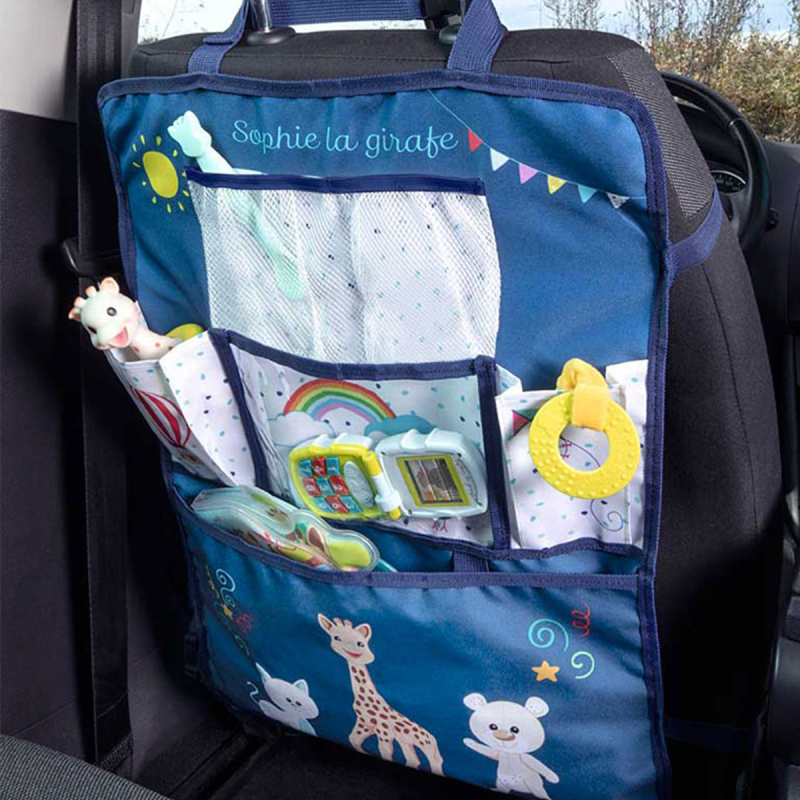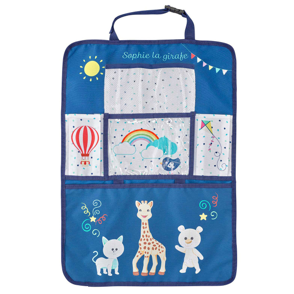 Θήκη οργάνωσης καθίσματος αυτοκινήτου σε μπλε χρώμα και σχέδιο ζωάκια από την εταιρία Sophie The Giraffe. Είναι υφασμάτινη και πρακτική καθώς διαθέτει πολλές τσέπες διαφόρων μεγεθών, με δίχτυ, ύφασμα και διαφάνεια. Χάρη στους ρυθμιζόμενους ιμάντες ταιριάζει σε όλα τα αυτοκίνητα. Εφαρμόζει πολύ εύκολα στο πίσω μέρος του καθίσματος του αυτοκινήτου, είτε του οδηγού είτε του επιβάτη. Ιδανική για ταξίδια και να οργανώσετε όλα τα απαραίτητα.