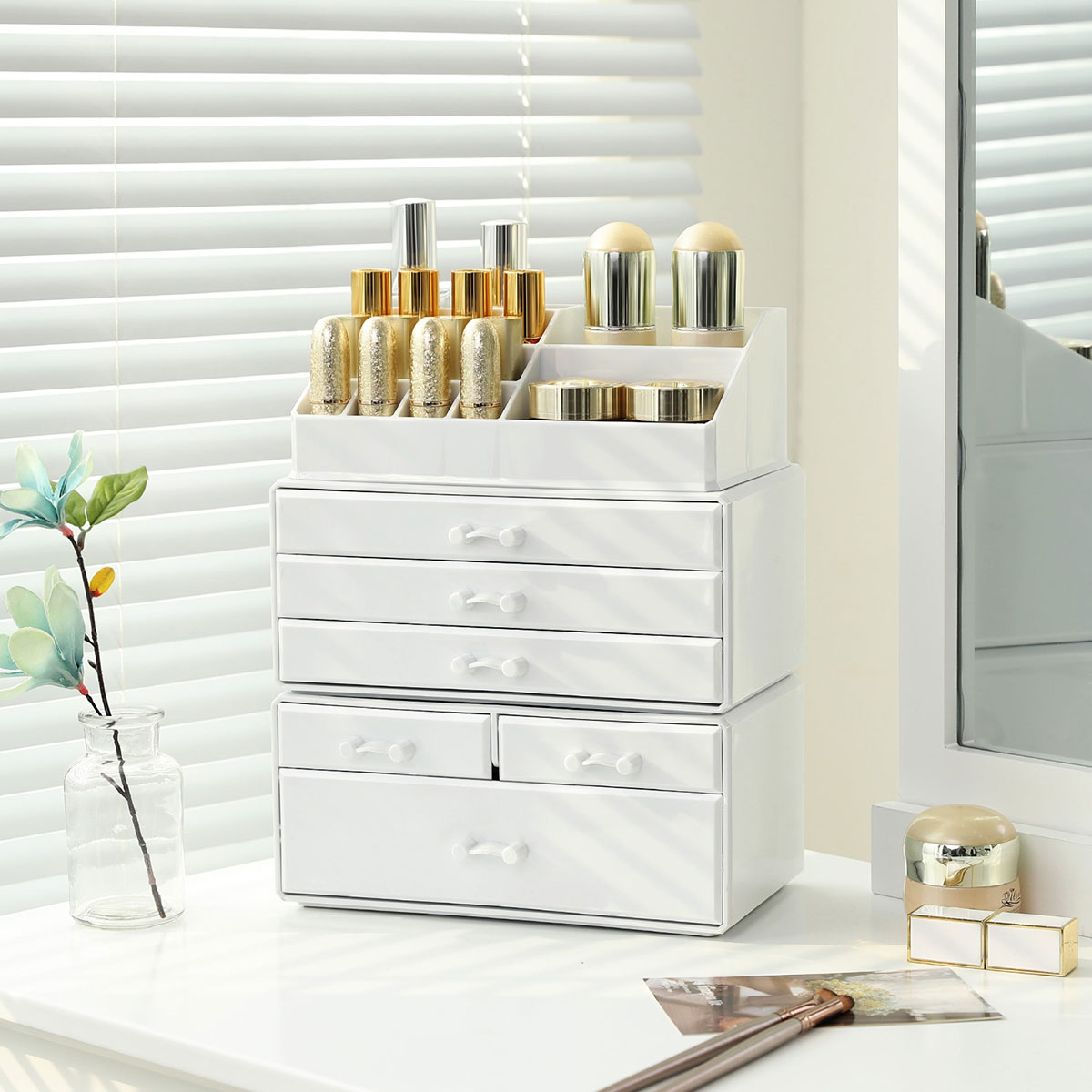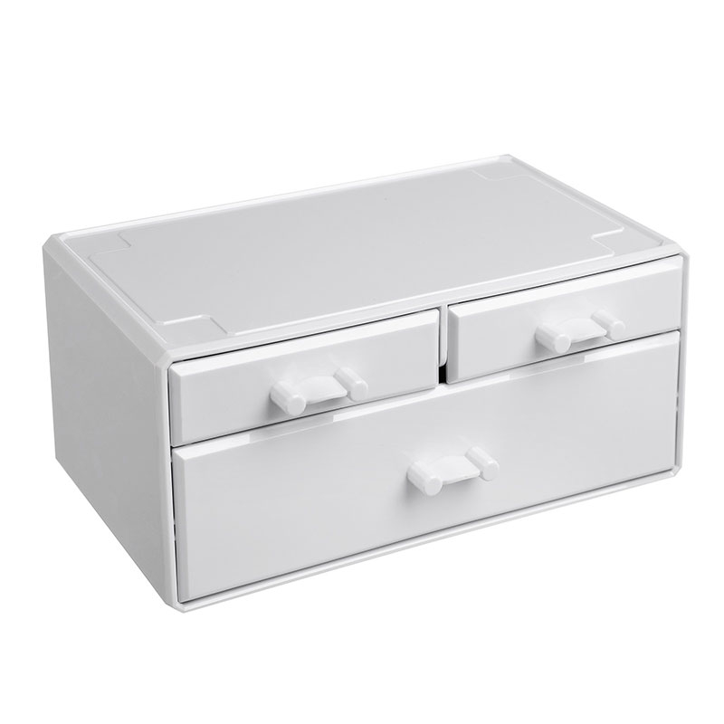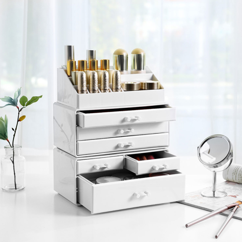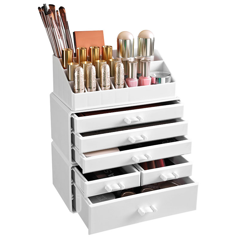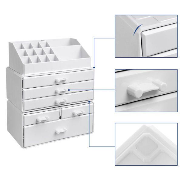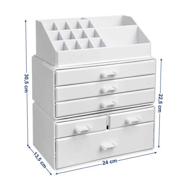 Κουτιά οργάνωσης σε σετ από την εταιρεία Songmics. Είναι κατασκευασμένα από ακρυλικό υλικό σε λευκό χρώμα. Το σετ αποτελείται από 1 κουτί με 15 θέσεις και 2 κουτιά με 3 συρτάρια το καθένα. Ιδανικό για να οργανώσετε καλύτερα τα μικροπράγματά σας όπως τα καλλυντικά, τα κοσμήματα ή ότι άλλο θέλετε.