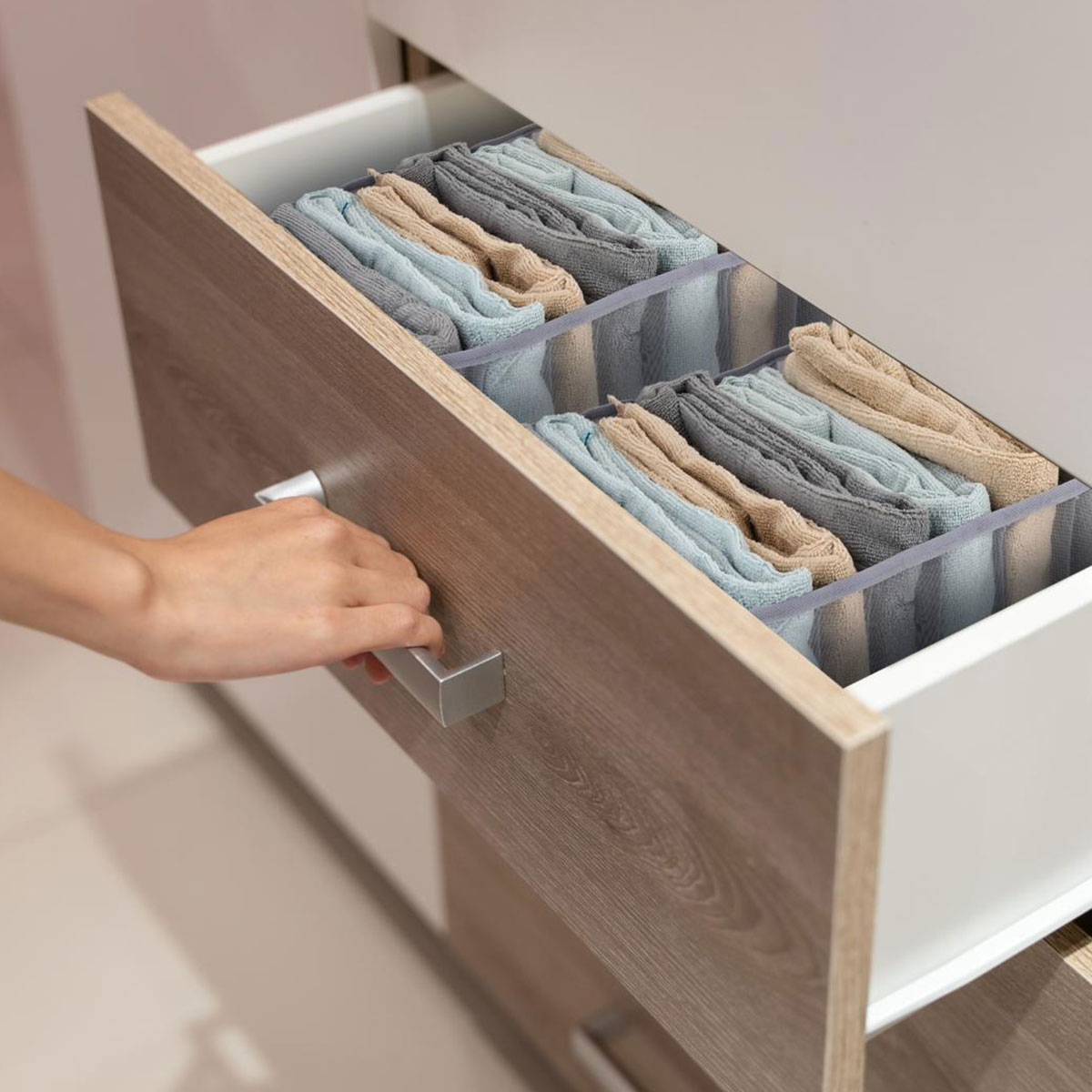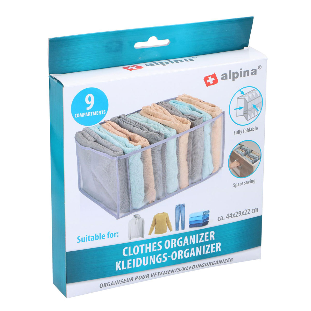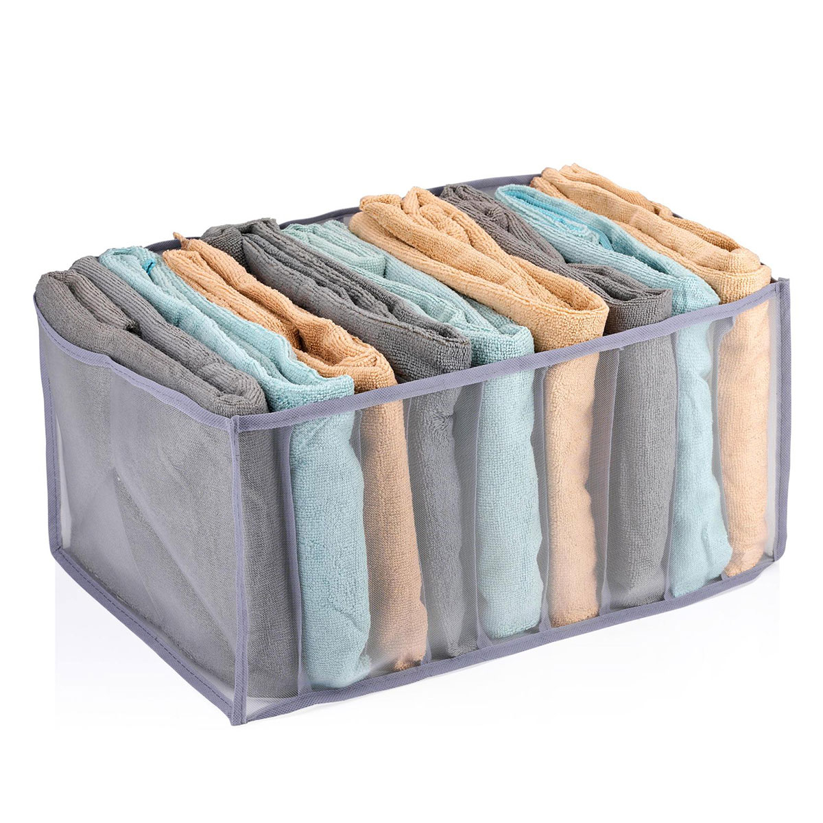 Θήκη οργάνωσης συρταριού/ ντουλάπας με 9 θέσεις. Είναι κατασκευασμένη από συνθετικό ύφασμα που αναπνέει σε γκρι απόχρωση. Ιδανική για να αποθηκεύσετε μπλούζες, πουκάμισα, παντελόνια, πετσέτες. Όταν δεν χρησιμοποιείται, μπορεί να διπλωθεί και να αποθηκευτεί για εξοικονόμηση χώρου.