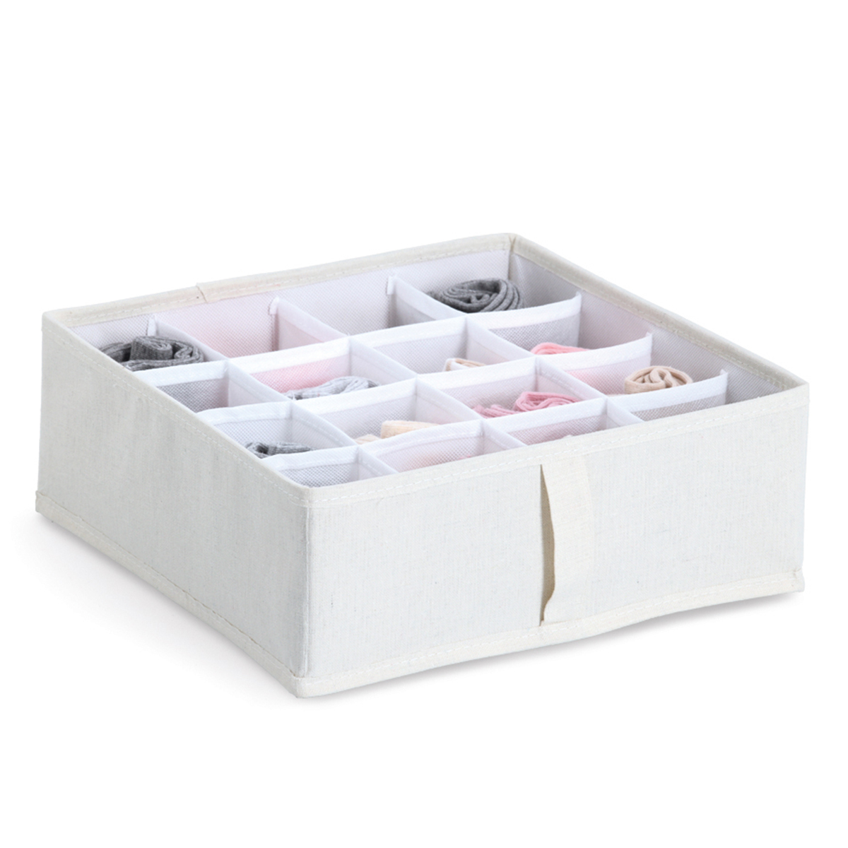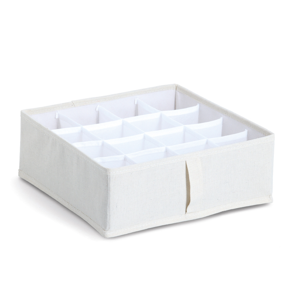 Θήκη οργάνωσης συρταριού 16 θέσεων κατασκευασμένη από συνθετικό ύφασμα non woven που αναπνέει σε εκρού χρώμα. Ιδανική για να αποθηκεύετε ζώνες, κάλτσες, εσώρουχα, γραβάτες κ.α. Όταν δεν χρησιμοποιείται, μπορεί να διπλωθεί και να αποθηκευτεί για εξοικονόμηση χώρου. Συνδυάστε τη με τα υπόλοιπα είδη της ίδιας σειράς για ένα ολοκληρωμένο αποτέλεσμα.