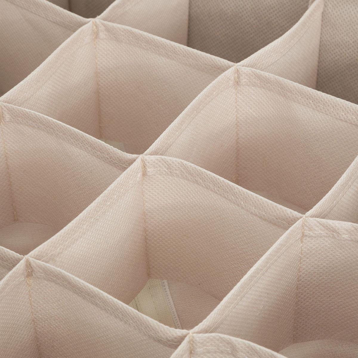 Θήκη οργάνωσης συρταριού 16 θέσεων με μίνιμαλ ύφος. Είναι κατασκευασμένη εξωτερικά από εκρού συνθετικό ύφασμα non woven που αναπνέει και εσωτερικά από χαρτόνι για να κρατάει το σχήμα της. Ιδανική για να αποθηκεύετε ζώνες, κάλτσες, εσώρουχα, γραβάτες κ.α. Όταν δεν χρησιμοποιείται, μπορεί να διπλωθεί και να αποθηκευτεί για εξοικονόμηση χώρου.