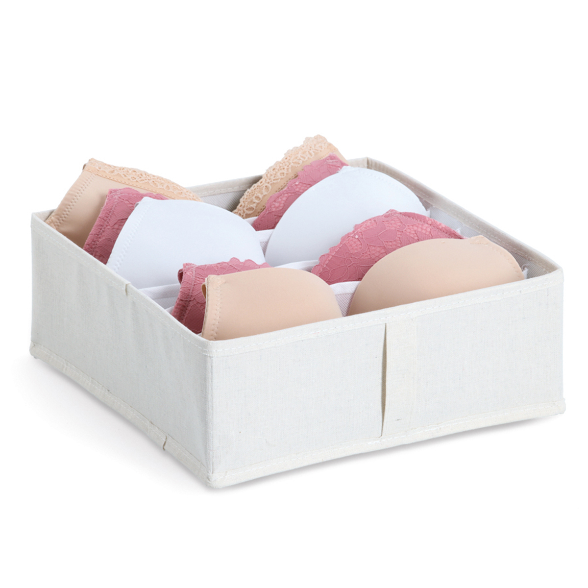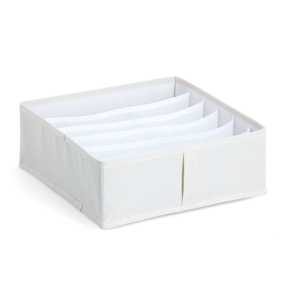 Θήκη οργάνωσης συρταριού 6 θέσεων κατασκευασμένη από συνθετικό ύφασμα non woven που αναπνέει σε εκρού χρώμα. Ιδανική για να αποθηκεύετε ζώνες, κάλτσες, εσώρουχα, γραβάτες κ.α. Όταν δεν χρησιμοποιείται, μπορεί να διπλωθεί και να αποθηκευτεί για εξοικονόμηση χώρου. Συνδυάστε τη με τα υπόλοιπα είδη της ίδιας σειράς για ένα ολοκληρωμένο αποτέλεσμα.