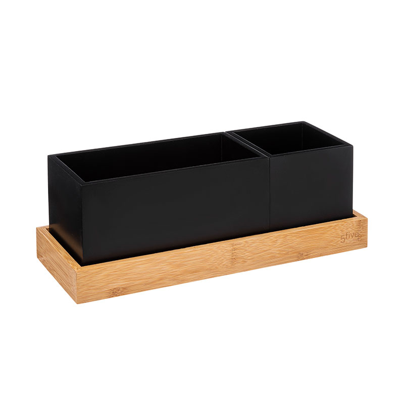 Θήκες οργάνωσης σε μαύρο χρώμα με μπεζ βάση. Είναι κατασκευασμένες από bamboo και ξύλο MDF. Ιδανική για να οργανώσετε τα πινέλα, lip-gloss, προϊόντα μακιγιάζ. Μπορεί να χρησιμοποιηθεί και σαν οργανωτής γραφείου για στυλό, χάρακες ή όπου αλλού θέλετε. Συνδυάστε το με τα υπόλοιπα προϊόντα της ίδιας συλλογής για ένα ολοκληρωμένο αποτέλεσμα.