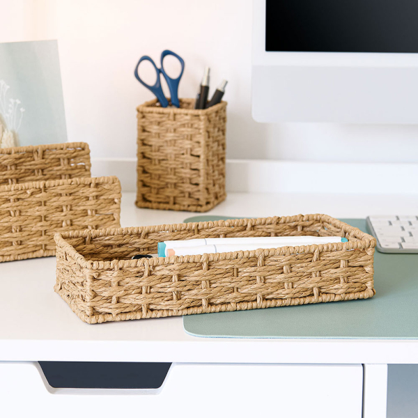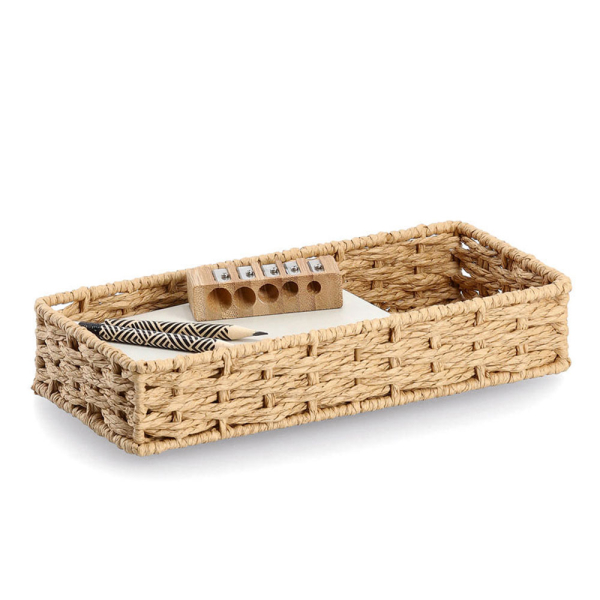 Θήκη οργάνωσης για να έχετε πάντα τακτοποιημένα τα πράγματα σας. Είναι κατασκευασμένη από πλεγμένο χάρτινο σχοινί σε μπεζ χρώμα. Ιδανικό για να το τοποθετήσετε ως οργανωτή γραφείου, στο μπουντουάρ ή στο σαλόνι. Συνδυάστε το με τα υπόλοιπα είδη του ίδιου σετ για ένα ολοκληρωμένο αποτέλεσμα στο χώρο σας.