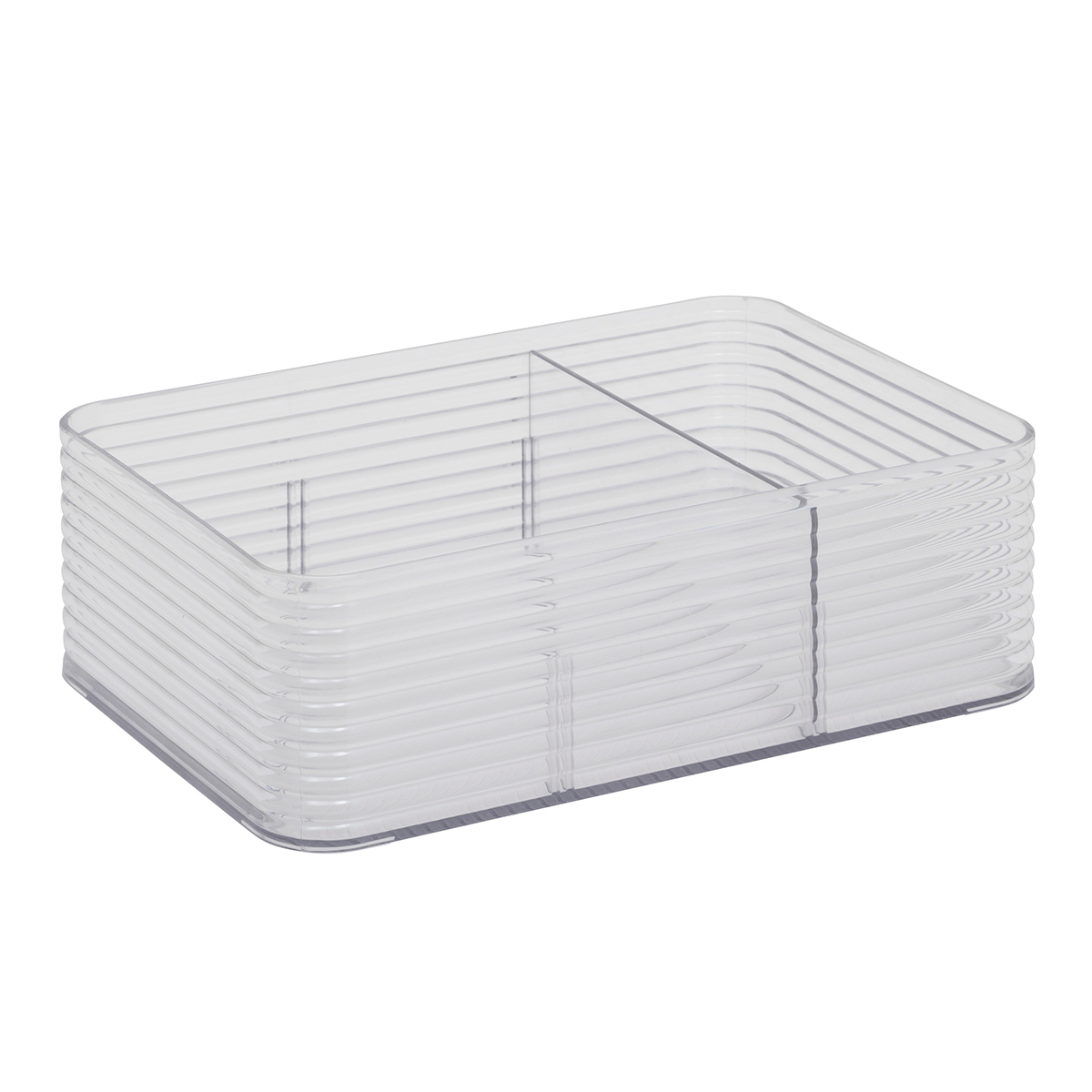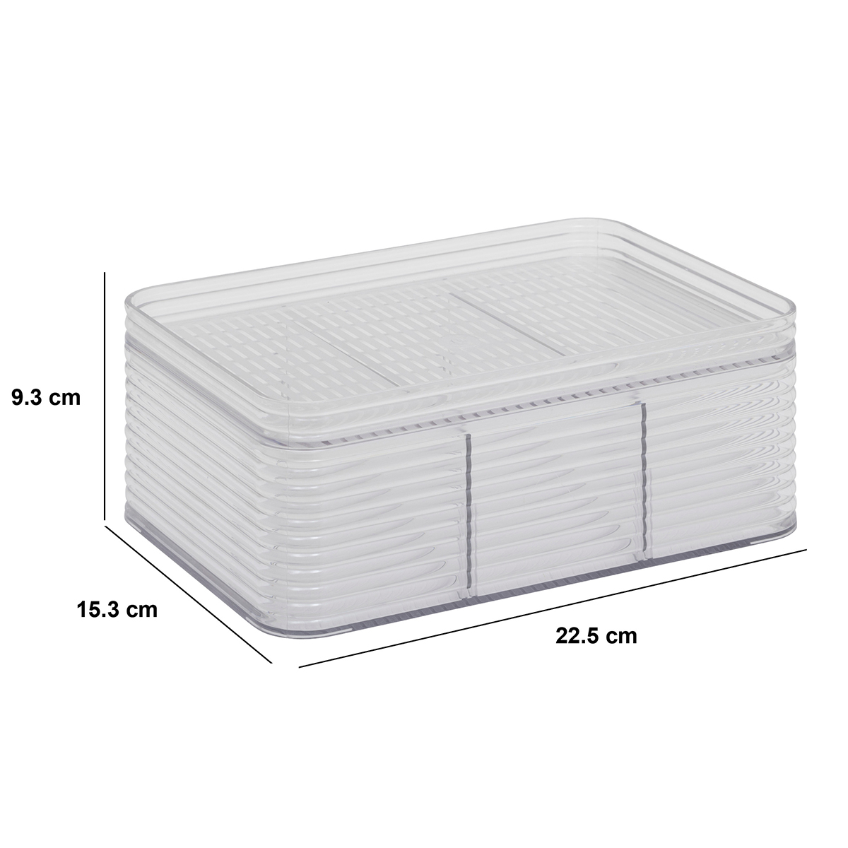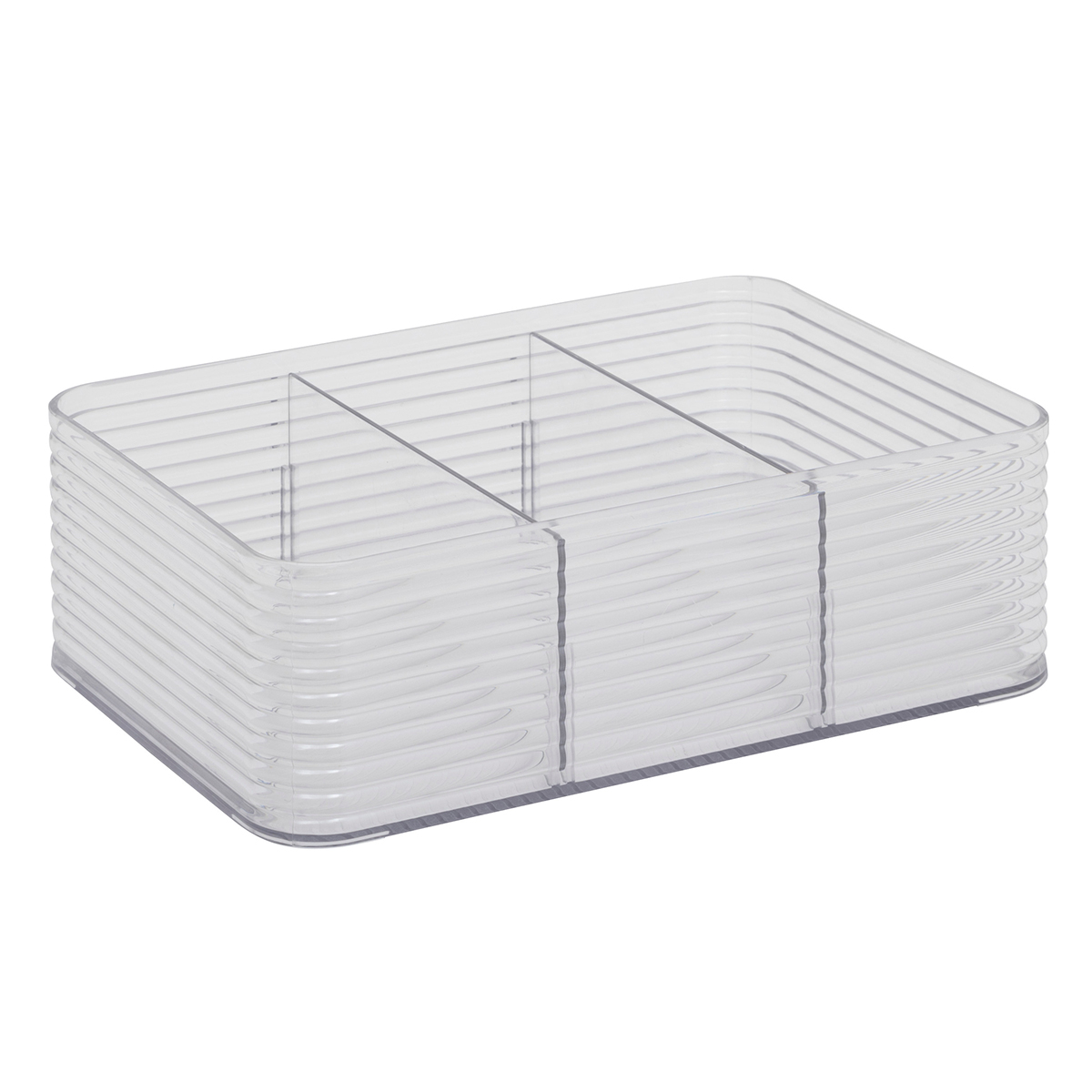 Θήκη οργάνωσης με 3 θέσεις και καπάκι, κατασκευασμένη από διάφανο πλαστικό υλικό. Τα διαχωριστικά είναι αποσπώμενα ώστε να διαμορφώσετε τους χώρους ανάλογα με τις ανάγκες σας. Ιδανική για καλλυντικά, κοσμήματα, μικροπράγματα ή ό,τι άλλο θέλετε. Μπορεί να τοποθετηθεί στο χώρο του μπάνιου, της κρεβατοκάμαρας ακόμα και ως οργανωτής γραφείου. Συνδυάστε το με τα υπόλοιπα προϊόντα της ίδιας συλλογής για ένα ολοκληρωμένο αποτέλεσμα.