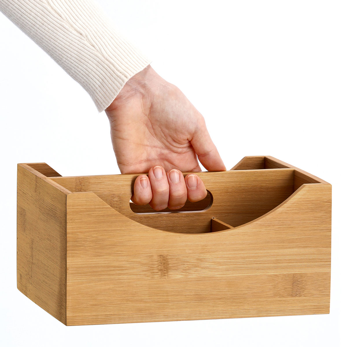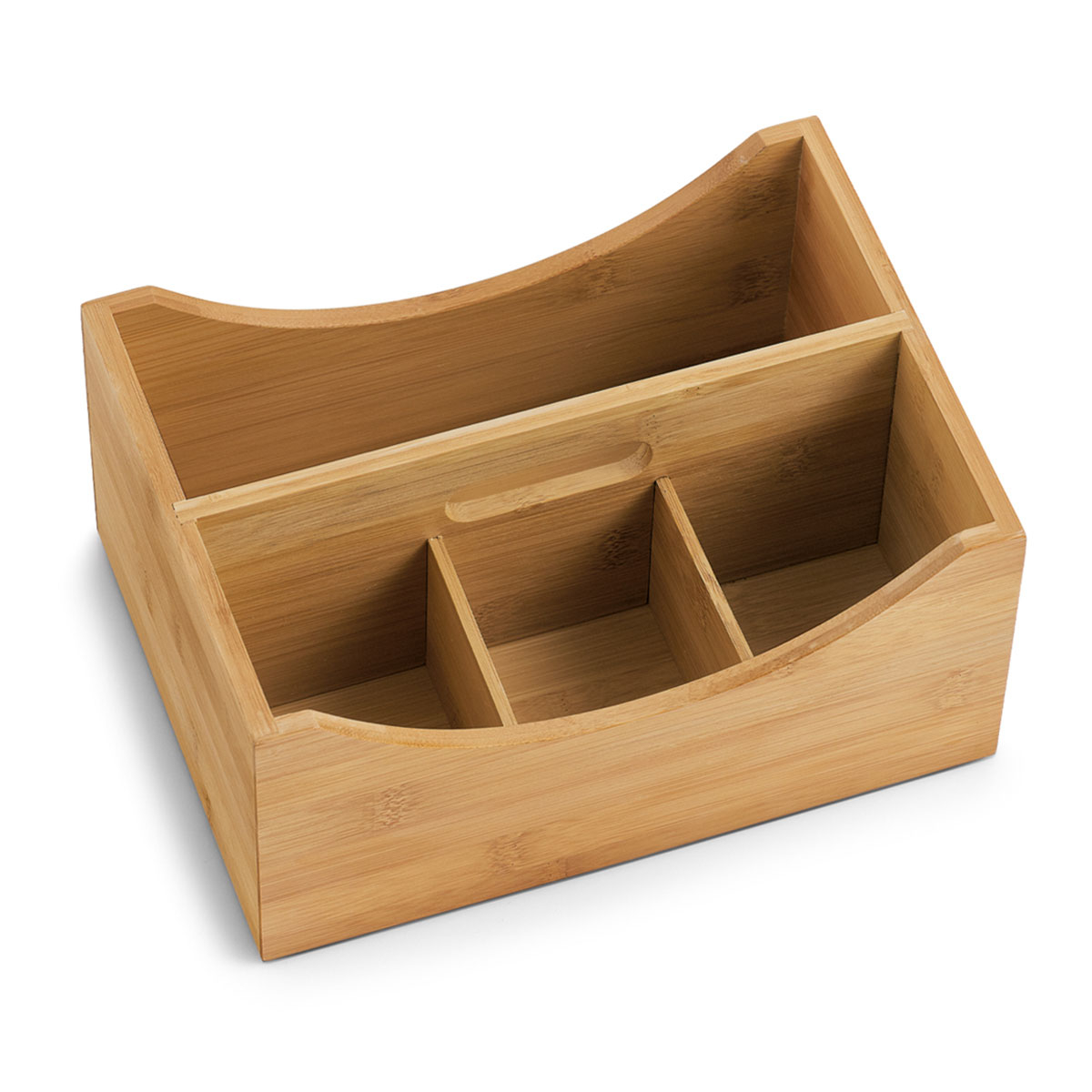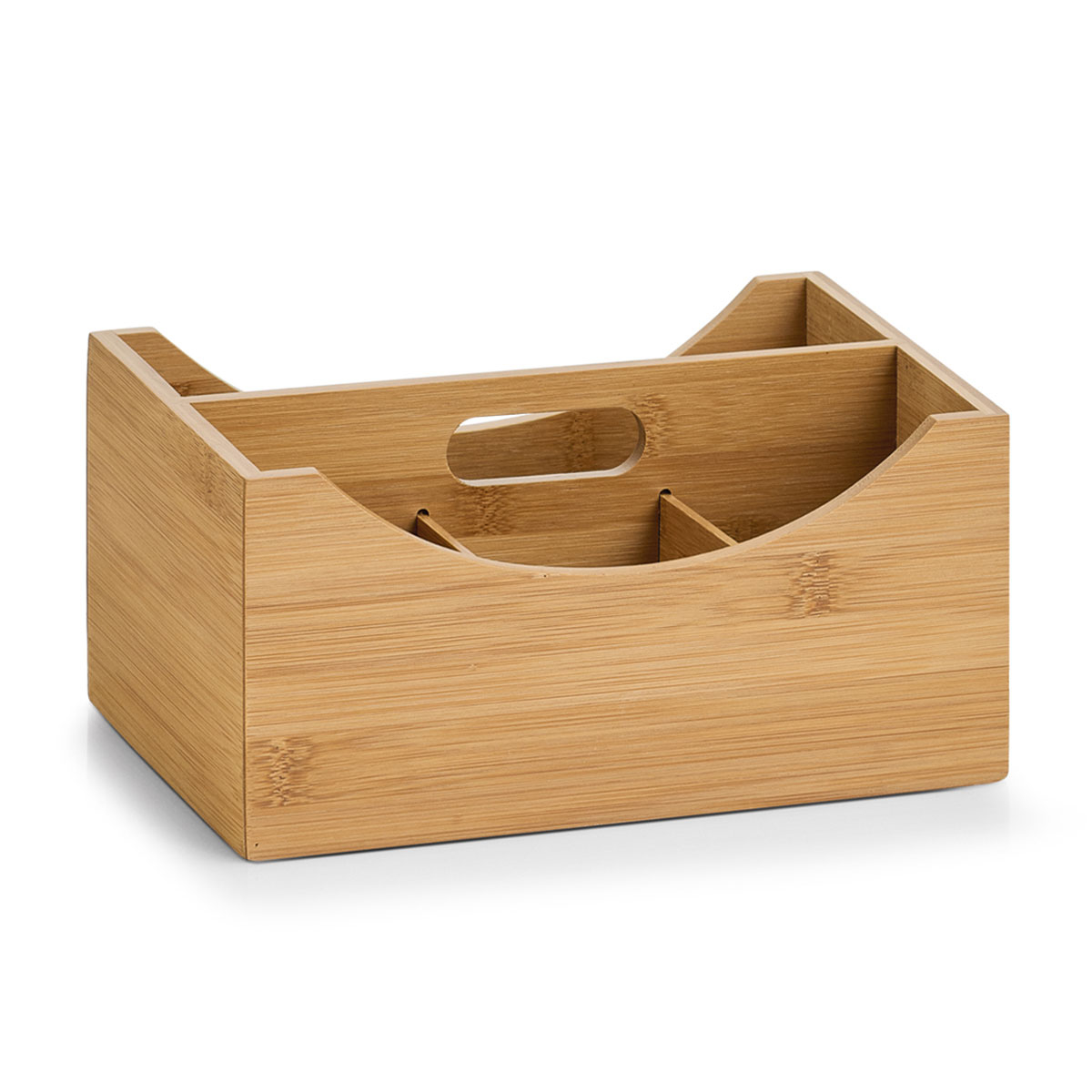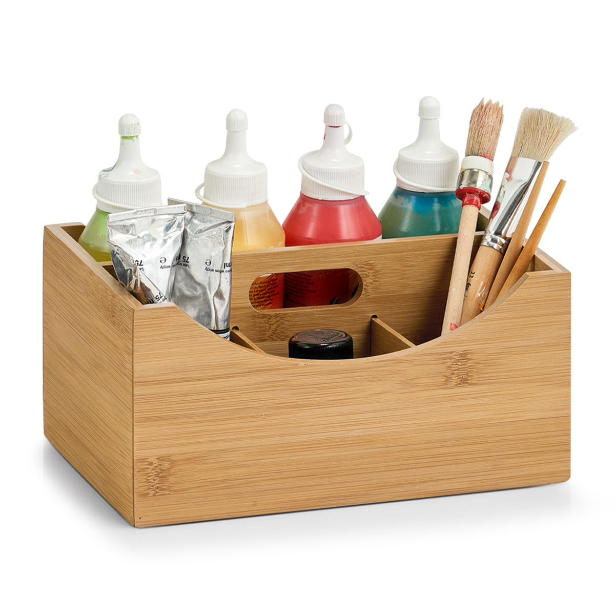 Θήκη οργάνωσης για γραφική ύλη, καλλυντικά ή ότι άλλο θέλετε για να έχετε πάντα τακτοποιημένα τα πράγματα σας. Είναι κατασκευασμένη από ξύλο bamboo και MDF σε μπεζ χρώμα. Ιδανικό για να το τοποθετήσετε στο γραφείου ή στο μπουντουάρ. Διαθέτει χωρίσματα που δημιουργούν 4 θέσεις διαφορετικών διαστάσεων και λαβή για εύκολη μεταφορά. Ιδανική για να αποθηκεύσετε πινέλα, lip-gloss, μολύβια, στυλό κλπ.