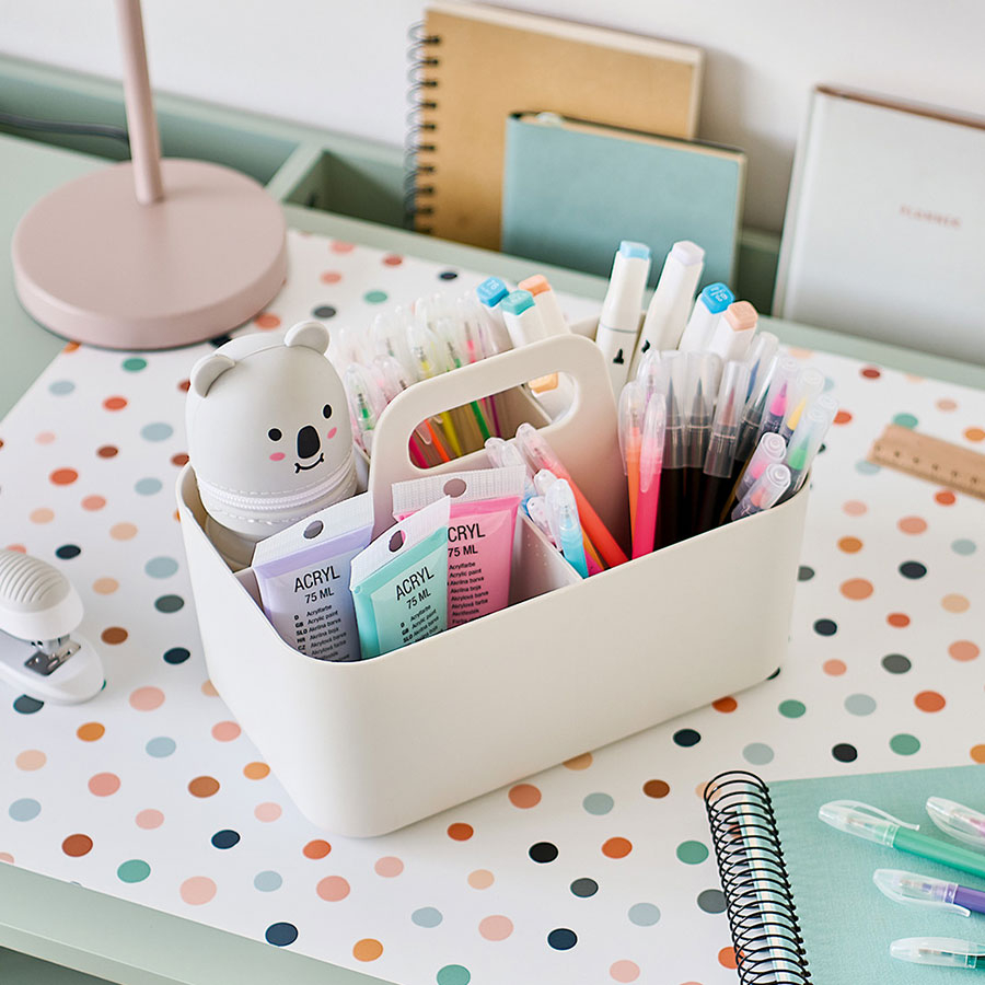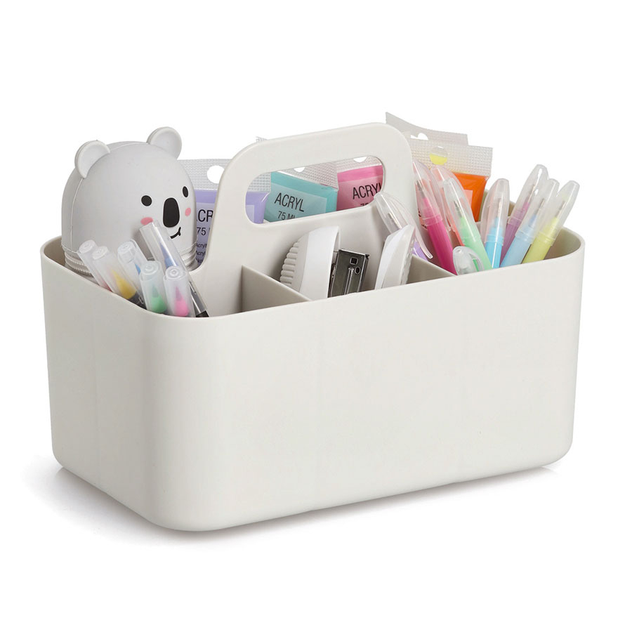 Θήκη οργάνωσης 5 θέσεων με λαβή και μοντέρνα αισθητική, για να οργανώσετε εύκολα και πρακτικά τον χώρο σας. Κατασκευασμένη από ανθεκτικό πλαστικό σε εκρού χρώμα, αποτελεί μία πρακτική και κομψή λύση αποθήκευσης για κάθε χώρο. Τα εσωτερικά διαχωριστικά βοηθούν στην τακτοποίηση μικροαντικειμένων, όπως στυλό, καλλυντικά, εργαλεία χειροτεχνίας ή αξεσουάρ γραφείου, διατηρώντας τα όλα οργανωμένα και εύκολα προσβάσιμα. Ιδανική για το σπίτι, το γραφείο ή το παιδικό δωμάτιο, προσφέρει ευελιξία και άνετη μεταφορά χάρη στο ενσωματωμένο χερούλι.