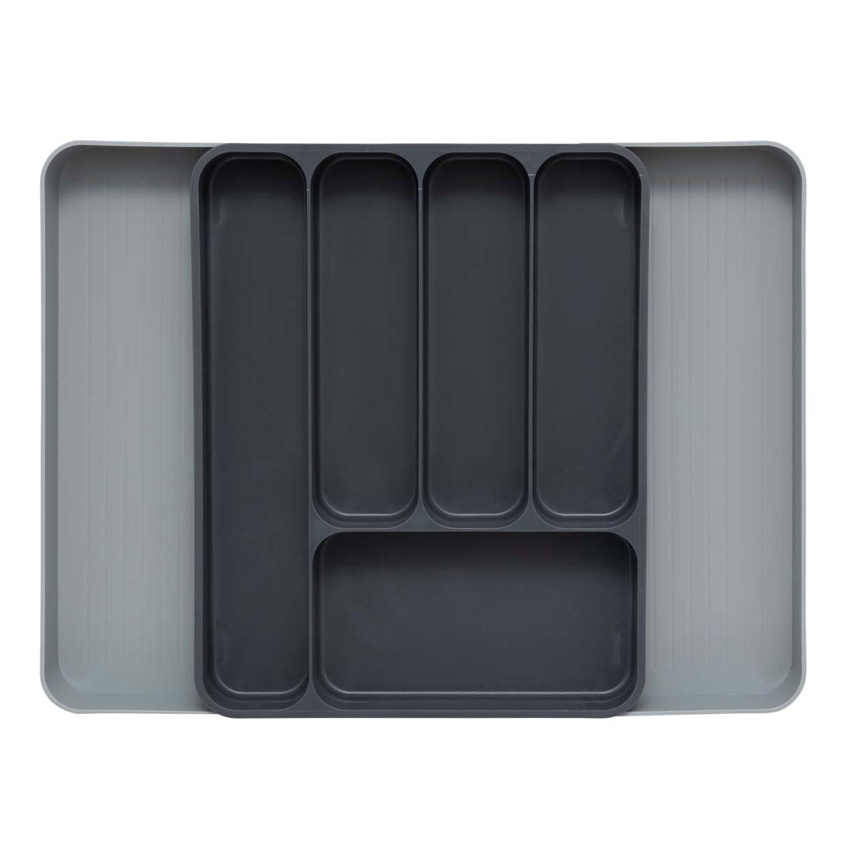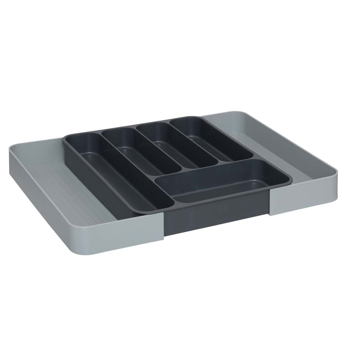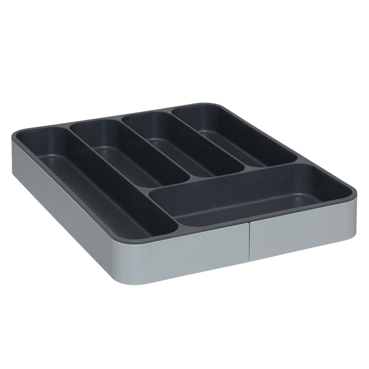 Θήκη συρταριού για μαχαιροπίρουνα σε γκρι αποχρώσεις. Είναι κατασκευασμένη από πλαστικό υλικό και κλειστή διαθέτει 5 θέσεις για να χωρίσετε τα μαχαιροπίρουνα σας. Ανάλογα με τις ανάγκες του συρταριού σας μπορείτε να την επεκτείνετε και να δημιουργήσετε άλλες 2 θέσεις.