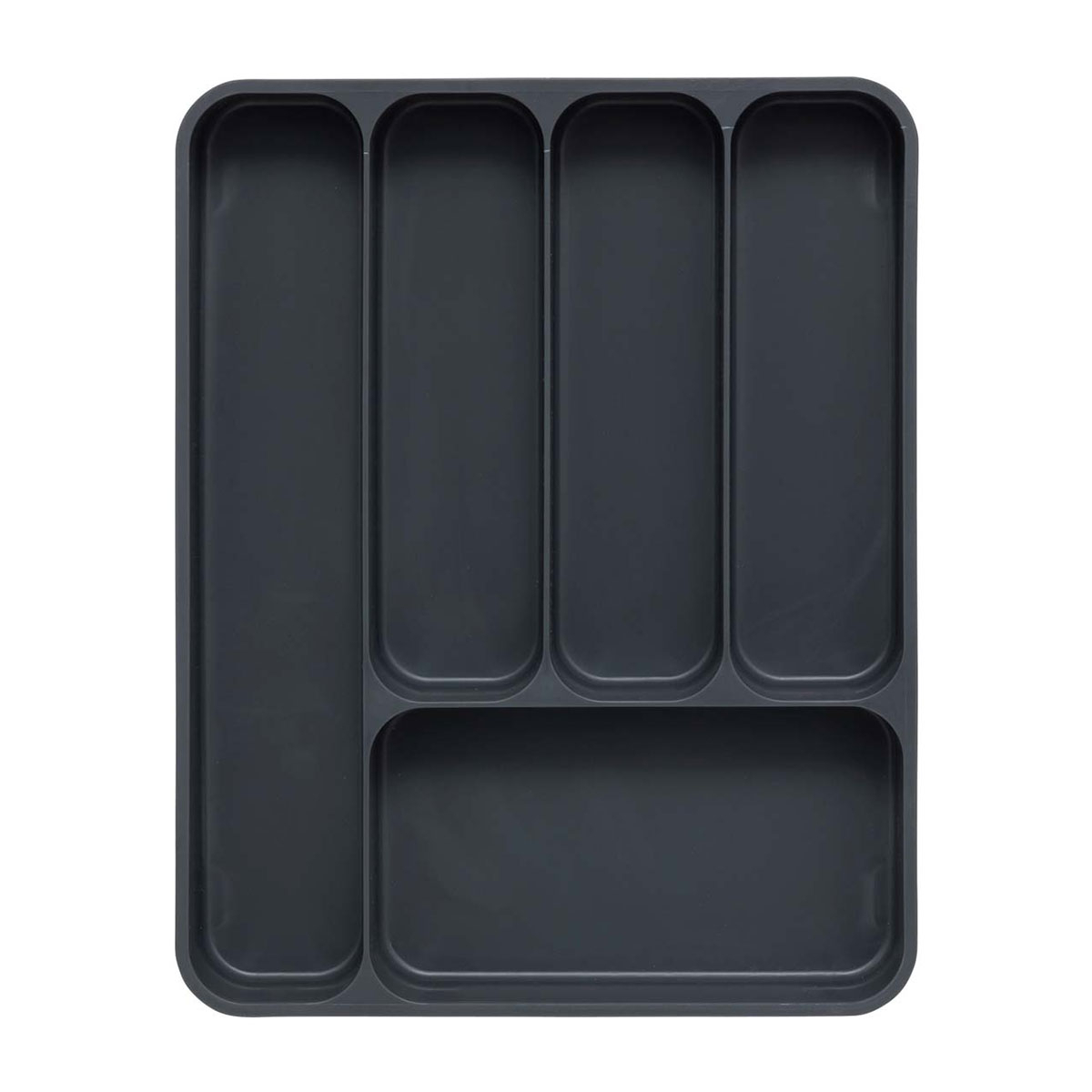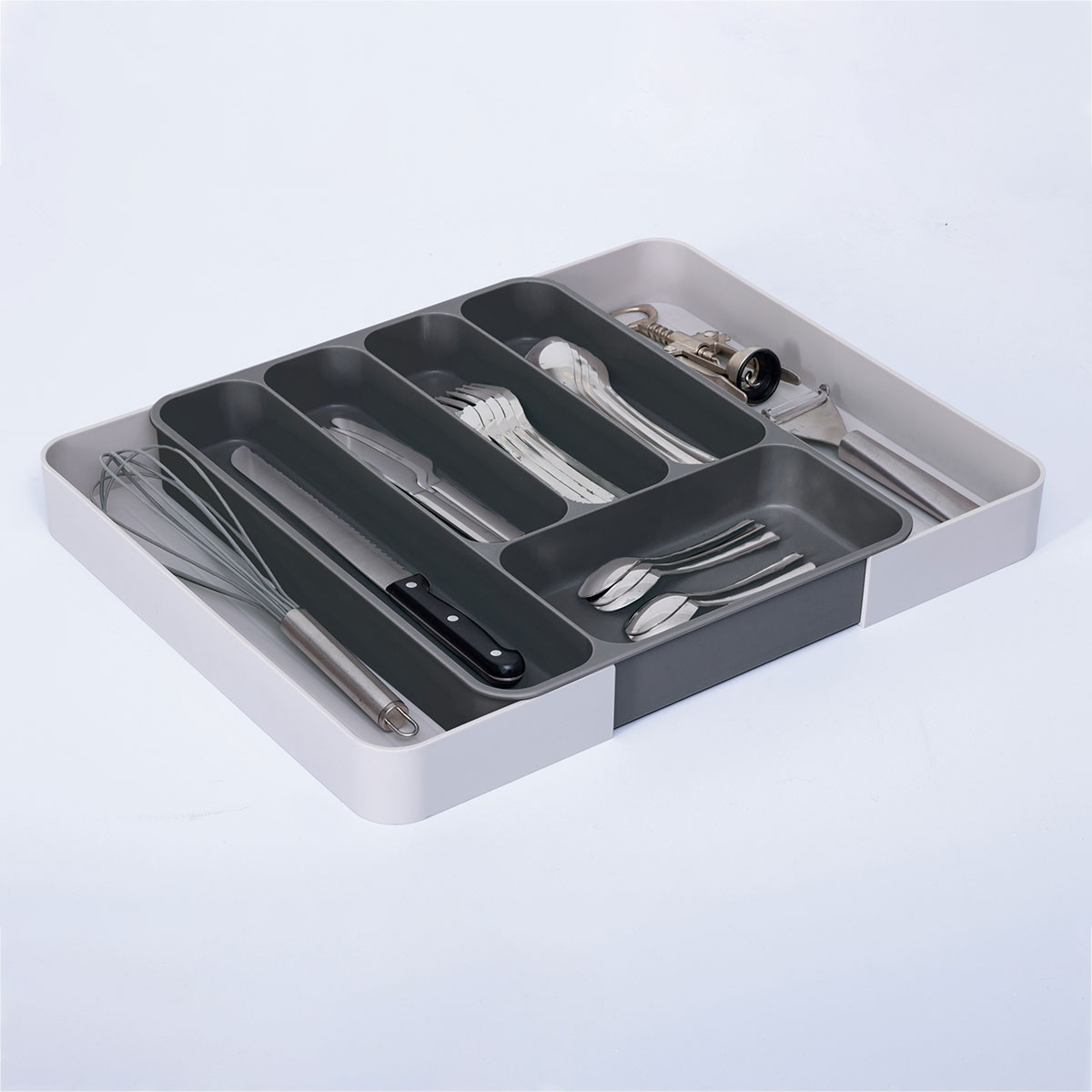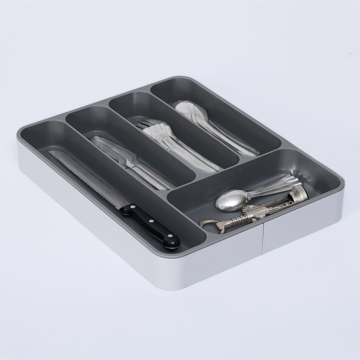 Θήκη συρταριού για μαχαιροπίρουνα σε γκρι αποχρώσεις. Είναι κατασκευασμένη από πλαστικό υλικό και κλειστή διαθέτει 5 θέσεις για να χωρίσετε τα μαχαιροπίρουνα σας. Ανάλογα με τις ανάγκες του συρταριού σας μπορείτε να την επεκτείνετε και να δημιουργήσετε άλλες 2 θέσεις.