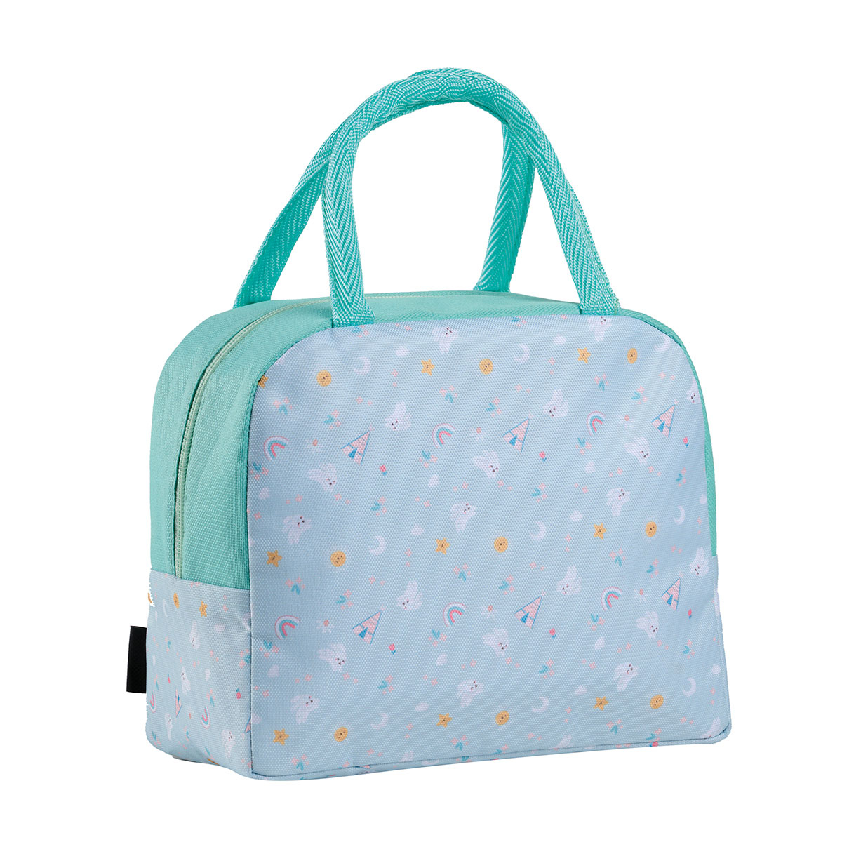 Ισοθερμική τσάντα φαγητού με σχέδιο ζωάκια σε γαλάζιες-βεραμάν αποχρώσεις και λευκές-ροζ λεπτομέρειες από την εταιρεία Kentia. Το εξωτερικό της ύφασμα είναι κατασκευασμένο από 100% polyester ενώ εσωτερικά διαθέτει ισοθερμική επένδυση για να διατηρεί την θερμοκρασία του περιεχομένου αμετάβλητη για πολλές ώρες. Διαθέτει λαβή μεταφοράς και κλείνει με φερμουάρ. Ιδανική τσάντα για να διατηρείτε το φαγητό του παιδιού σας κρύο ή ζεστό στο σχολείο, στην εκδρομή ή οπουδήποτε αλλού επιθυμείτε.