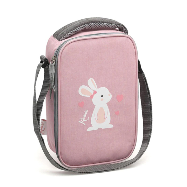 Ισοθερμική τσάντα φαγητό σε ροζ χρώμα, με μπλε γκρι λεπτομέρειες και σχέδιο λαγουδάκι από την εταιρεία Kiokids. Το εξωτερικό ύφασμα είναι κατασκευασμένο από 100% nylon και το εσωτερικό είναι υλικό EVA, κατάλληλο για επαφή με τρόφιμα. Έχει χωρητικότητα 2.5 λίτρα. Ιδανική τσάντα για εκδρομές, pic nic και ότι άλλο επιθυμείτε.