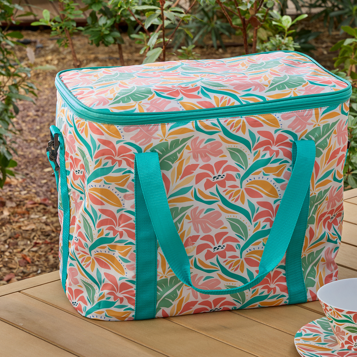 Ισοθερμική τσάντα φαγητού από ύφασμα polyester σε πορτοκαλί και τυρκουάζ αποχρώσεις. Διαθέτει ιμάντα για να την μεταφέρετε στον ώμο και άνοιγμα με φερμουάρ στο πάνω μέρος. Ιδανική για την παραλία, το camping και τις εκδρομές. Χωρητικότητα 30lt.