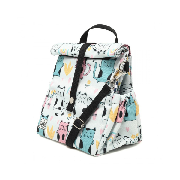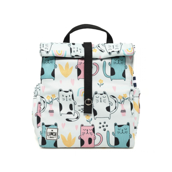 Ισοθερμική τσάντα φαγητού σε λευκό χρώμα με πολύχρωμες λεπτομέρειες και γάτες στο σχέδιο από την εταιρεία The Lunch Bags. Το εξωτερικό της ύφασμα είναι κατασκευασμένο από 100% βαμβάκι ενώ εσωτερικά διαθέτει ισοθερμικό μηχανισμό Hot&Cold© για να διατηρεί την θερμοκρασία του γεύματός σας αμετάβλητη για πολλές ώρες. Κλείνει με ταινία velcro και κόπιτσα. Διαθέτει ρυθμιζόμενο λουρί ώμου. Έχει χωρητικότητα 5 λίτρων, κατάλληλη για φαγητό ενός ατόμου. Ιδανική τσάντα για να διατηρείτε το φαγητό σας κρύο ή ζεστό, στην δουλειά, στην βόλτα ή οπουδήποτε αλλού επιθυμείτε. Όλα τα προϊόντα της ελληνικής εταιρίας The Lunch Bags, είναι χειροποίητα και κατασκευασμένα από βαμβάκι με γνώμονα τον σεβασμό προς το περιβάλλον.