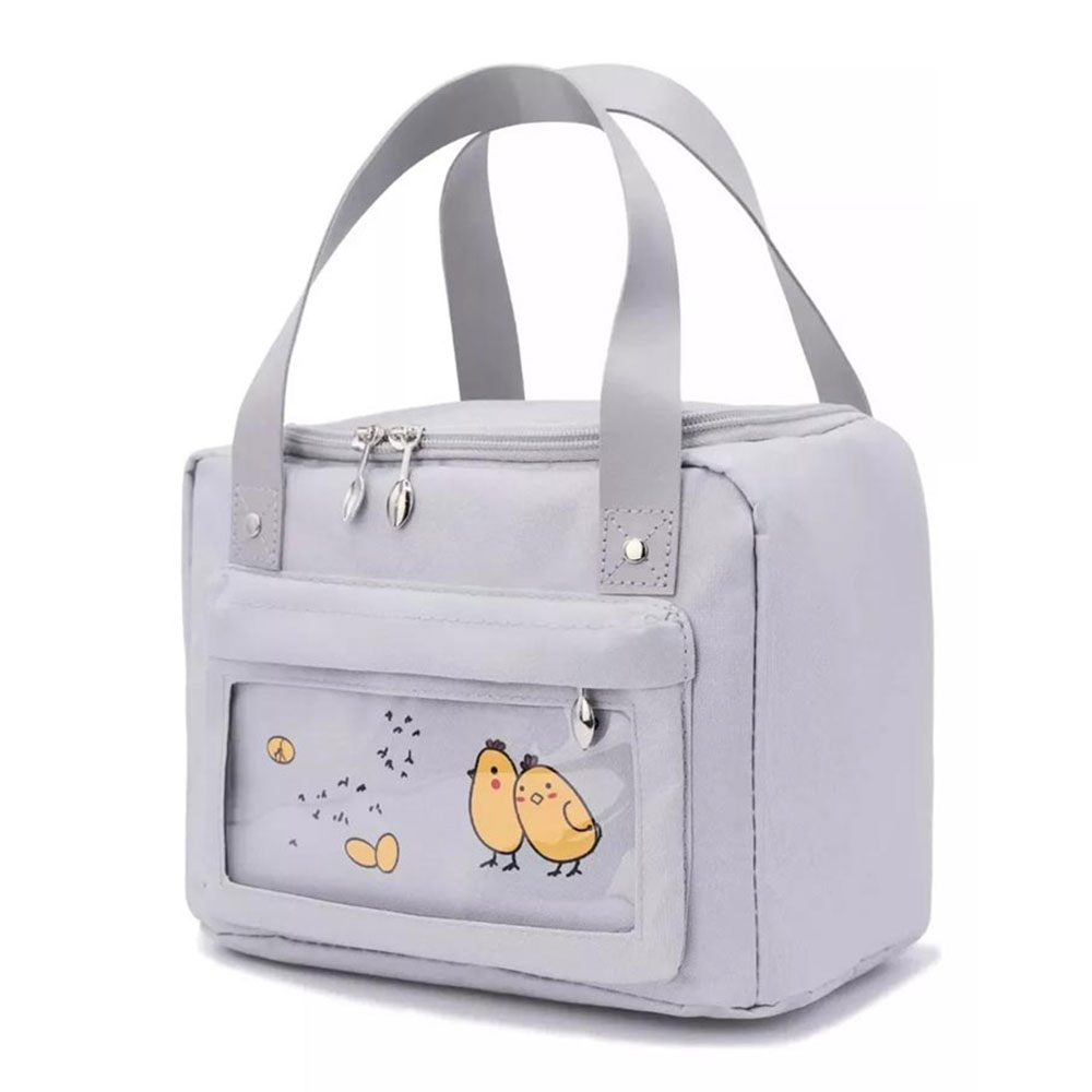 Ισοθερμική τσάντα φαγητού χωρητικότητας 6 λίτρων από την εταιρεία Amber σε γκρι χρώμα με κίτρινα κοτοπουλάκια. Είναι κατασκευασμένη εξωτερικά από πολυεστερικό ύφασμα oxford. Το εσωτερικό της είναι κατασκευασμένο από ειδικό θερμομονωτικό υλικό. Έχει μία ενιαία κεντρική θήκη που κλείνει με φερμουάρ και 1 μικρό τσεπάκι στο μπροστινό μέρος. Έχει λαβές μεταφοράς για να μεταφέρετε εύκολα. Ιδανική τσάντα μεταφοράς φαγητού στο σχολείο, στις βόλτες και στις εκδρομές.