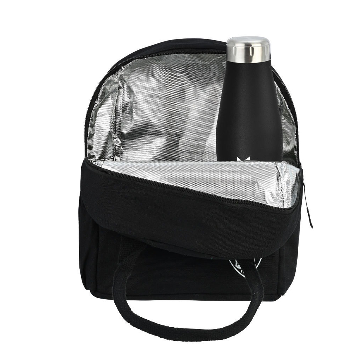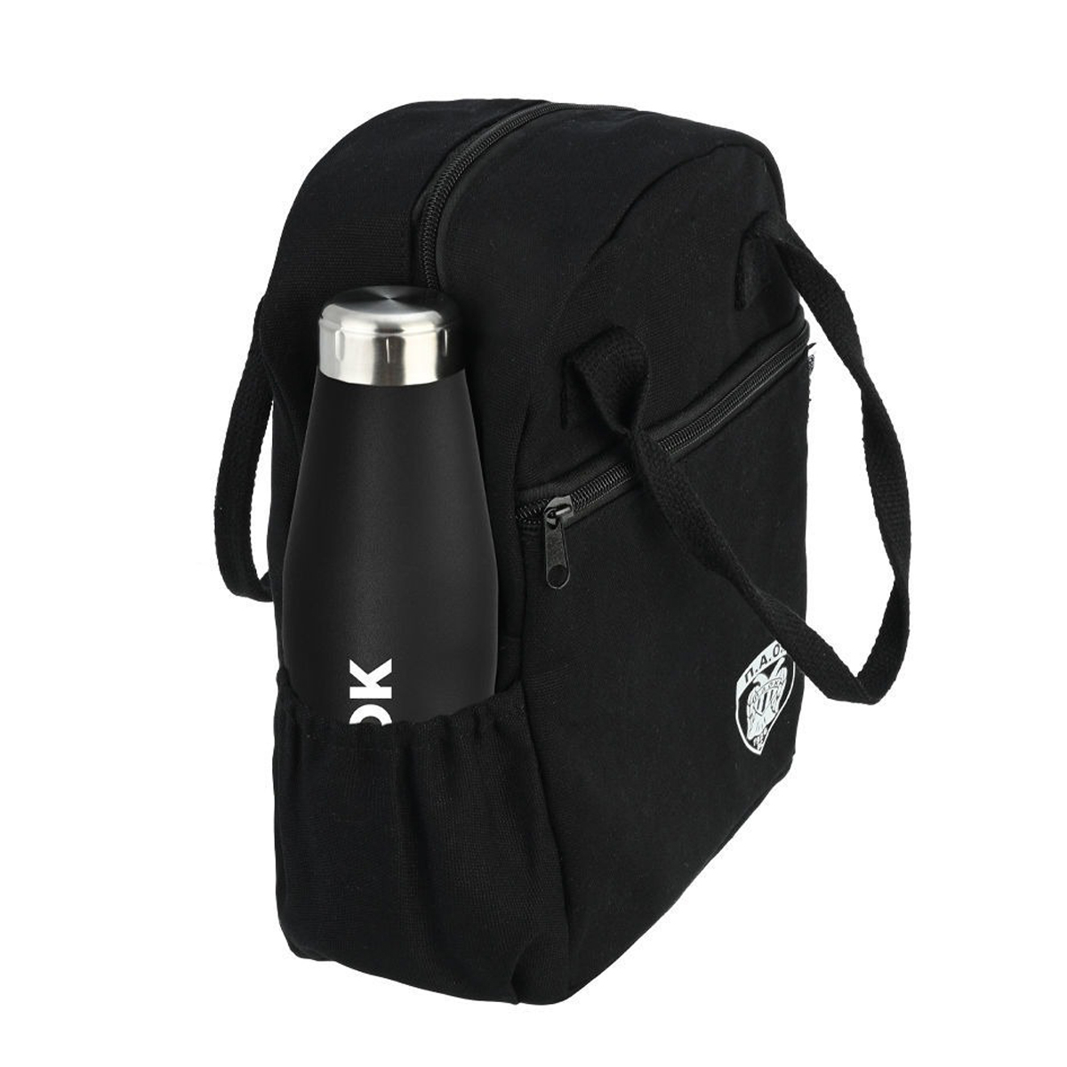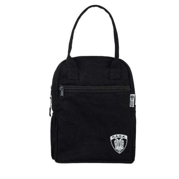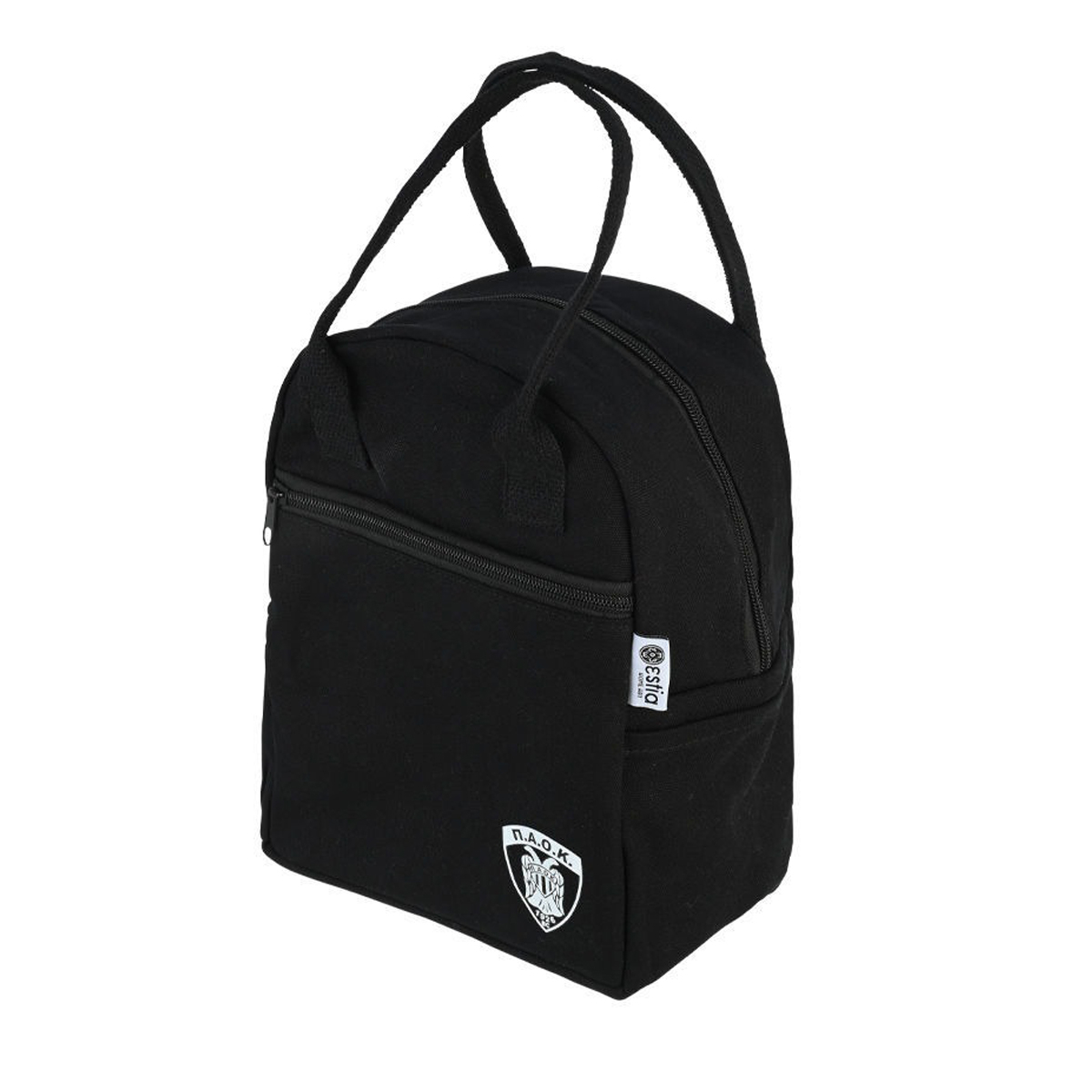 Ισοθερμική τσάντα φαγητού σε μαύρο χρώμα από την εταιρεία εstia και τη σειρά Paok BC. Εξωτερικά έχει ανθεκτικό ύφασμα από 100% βαμβάκι και εσωτερικά έχει ισοθερμική επένδυση που διατηρεί την θερμοκρασία του φαγητού ή του ποτού σας για περισσότερη ώρα. Διαθέτει 2 θέσεις για μπουκάλια, μία στην κύρια θήκη και μία εξωτερικά για να μένει το περιεχόμενο του μπουκαλιού στην κατάλληλη θερμοκρασία. Κλείνει με φερμουάρ και μεταφέρεται εύκολα χάρη στις πρακτικές λαβές της. Με εξωτερική θήκη που κλείνει με φερμουάρ για να τοποθετήσετε τα κλειδιά, το κινητό ή ότι άλλο χρειάζεστε. Ιδανική για το γραφείο, το σχολείο και οποιαδήποτε άλλη δραστηριότητα. Χωρητικότητα: 7lt.
