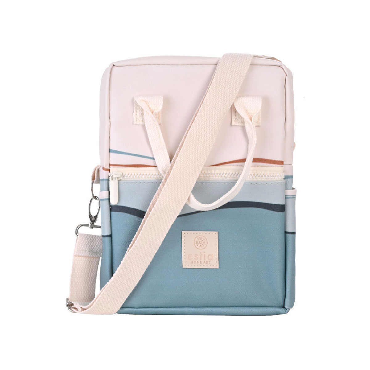 Ισοθερμική τσάντα φαγητού από την εταιρεία εstia σε μπεζ-μπλε χρώμα με μοντέρνο σχέδιο. Είναι μέρος της συλλογής "Save The Aegean". Η εταιρεία εstia συνεισφέρει στον οργανισμό "Save The Aegean" με 1% επί των πωλήσεων, για καθαρότερες θάλασσες και ένα καλύτερο αύριο. Η εξωτερική επιφάνεια της τσάντας είναι κατασκευασμένη από PVC leather, ένα ανθεκτικό συνθετικό υλικό που προσφέρει κομψή εμφάνιση και μεγάλη διάρκεια ζωής. Το υφασμα αυτό προσομοιώνει την εμφάνιση και υφή του φυσικού δέρματος, αλλά είναι κατασκευασμένο από PVC, ένα είδος πλαστικού. Διαθέτει ισοθερμική επένδυση και η τσάντα κλείνει με φερμουάρ. Θήκη για μπουκάλι ή θερμός εσωτερικά και εξωτερικά. Επίσης, έχει μια μπροστινή τσέπη με φερμουάρ για μικροαντικείμενα. Η άνετη λαβή της είναι πολύ πρακτική για μεταφορά. Στα πλαϊνά διαθέτει θηλιές για να βάλετε το λουρί και να μπορείτε να την κρεμάτε είτε από τον ώμο είτε χιαστί. Ιδανική για το γραφείο, το σχολείο και οποιαδήποτε άλλη δραστηριότητα. Συνδυάστε το με το λουράκι τσάντας Lily White για ένα ολοκληρωμένο αποτέλεσμα. *Το λουρί πωλείται ξεχωριστά.*