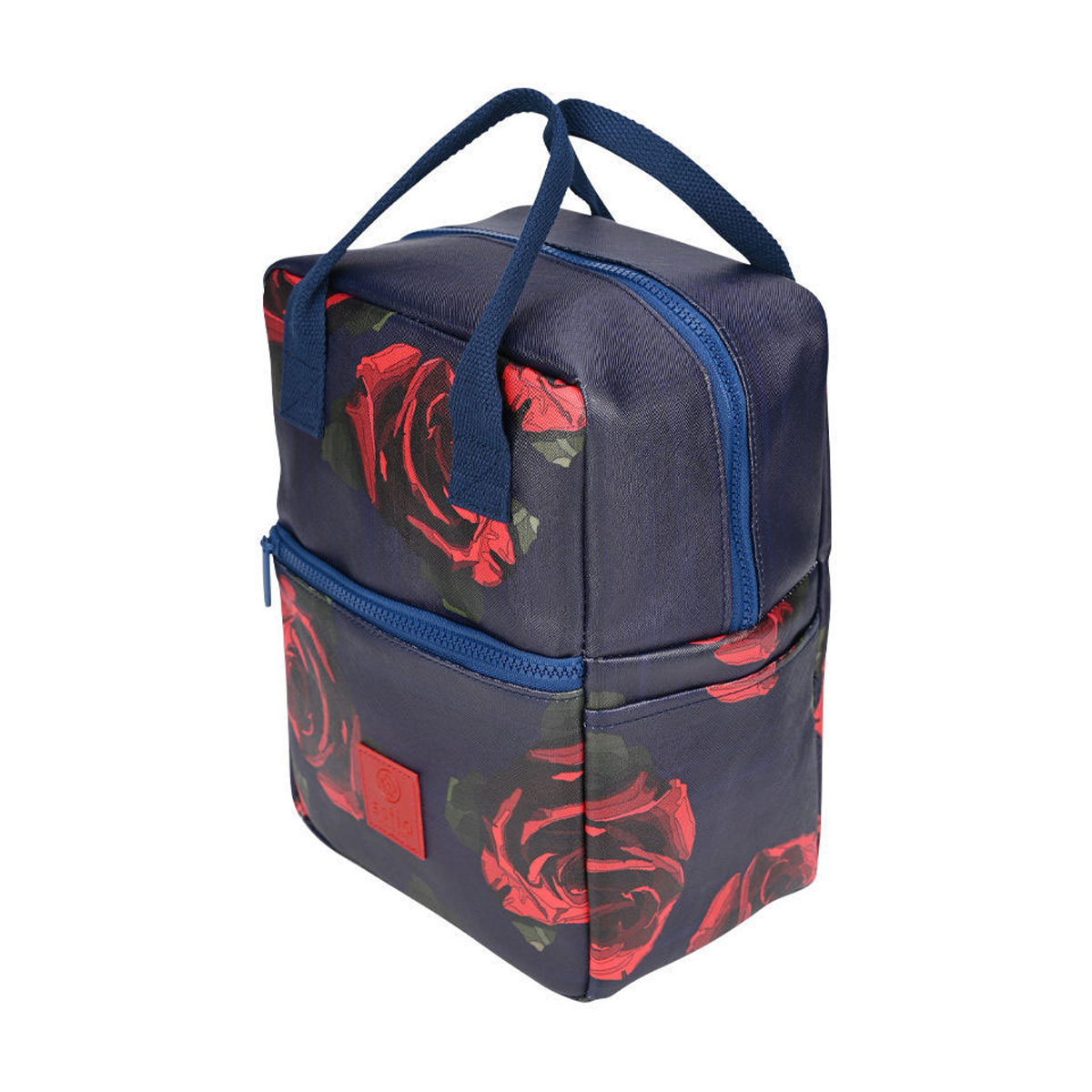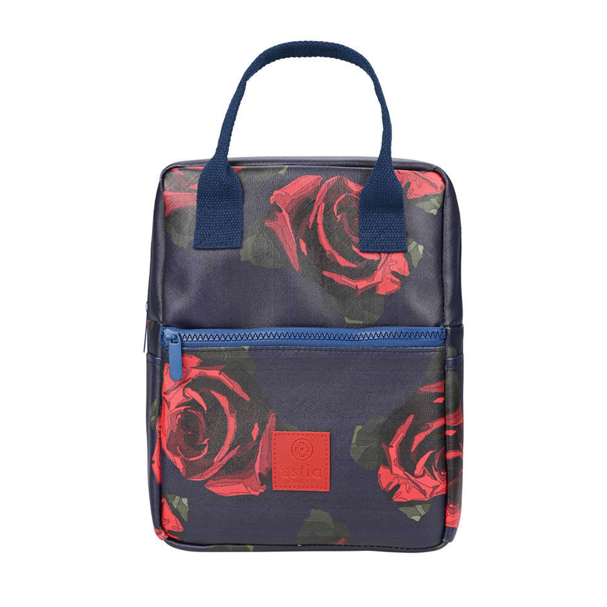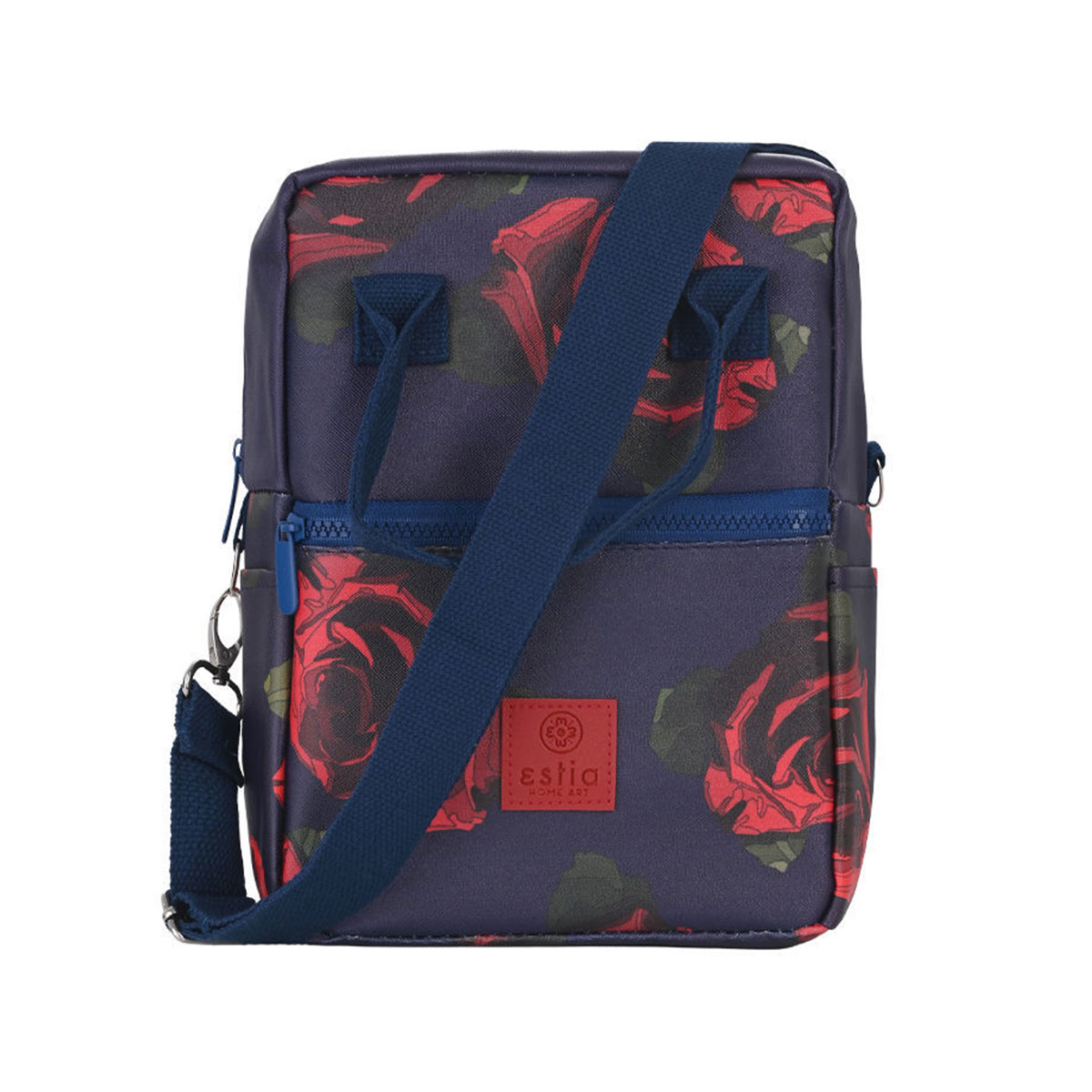 Ισοθερμική τσάντα φαγητού από την εταιρεία εstia σε μπλε χρώμα με κόκκινα τριαντάφυλλα στο σχέδιο. Είναι μέρος της συλλογής "Save The Aegean". Η εταιρεία εstia συνεισφέρει στον οργανισμό "Save The Aegean" με 1% επί των πωλήσεων, για καθαρότερες θάλασσες και ένα καλύτερο αύριο. Η εξωτερική επιφάνεια της τσάντας είναι κατασκευασμένη από PVC leather, ένα ανθεκτικό συνθετικό υλικό που προσφέρει κομψή εμφάνιση και μεγάλη διάρκεια ζωής. Το υφασμα αυτό προσομοιώνει την εμφάνιση και υφή του φυσικού δέρματος, αλλά είναι κατασκευασμένο από PVC, ένα είδος πλαστικού. Διαθέτει ισοθερμική επένδυση και η τσάντα κλείνει με φερμουάρ. Θήκη για μπουκάλι ή θερμός εσωτερικά και εξωτερικά. Επίσης, έχει μια μπροστινή τσέπη με φερμουάρ για μικροαντικείμενα. Η άνετη λαβή της είναι πολύ πρακτική για μεταφορά. Στα πλαϊνά διαθέτει θηλιές για να βάλετε το λουρί και να μπορείτε να την κρεμάτε είτε από τον ώμο είτε χιαστί. Ιδανική για το γραφείο, το σχολείο και οποιαδήποτε άλλη δραστηριότητα. Συνδυάστε το με το λουράκι τσάντας Royal Blue για ένα ολοκληρωμένο αποτέλεσμα. *Το λουρί πωλείται ξεχωριστά.*
