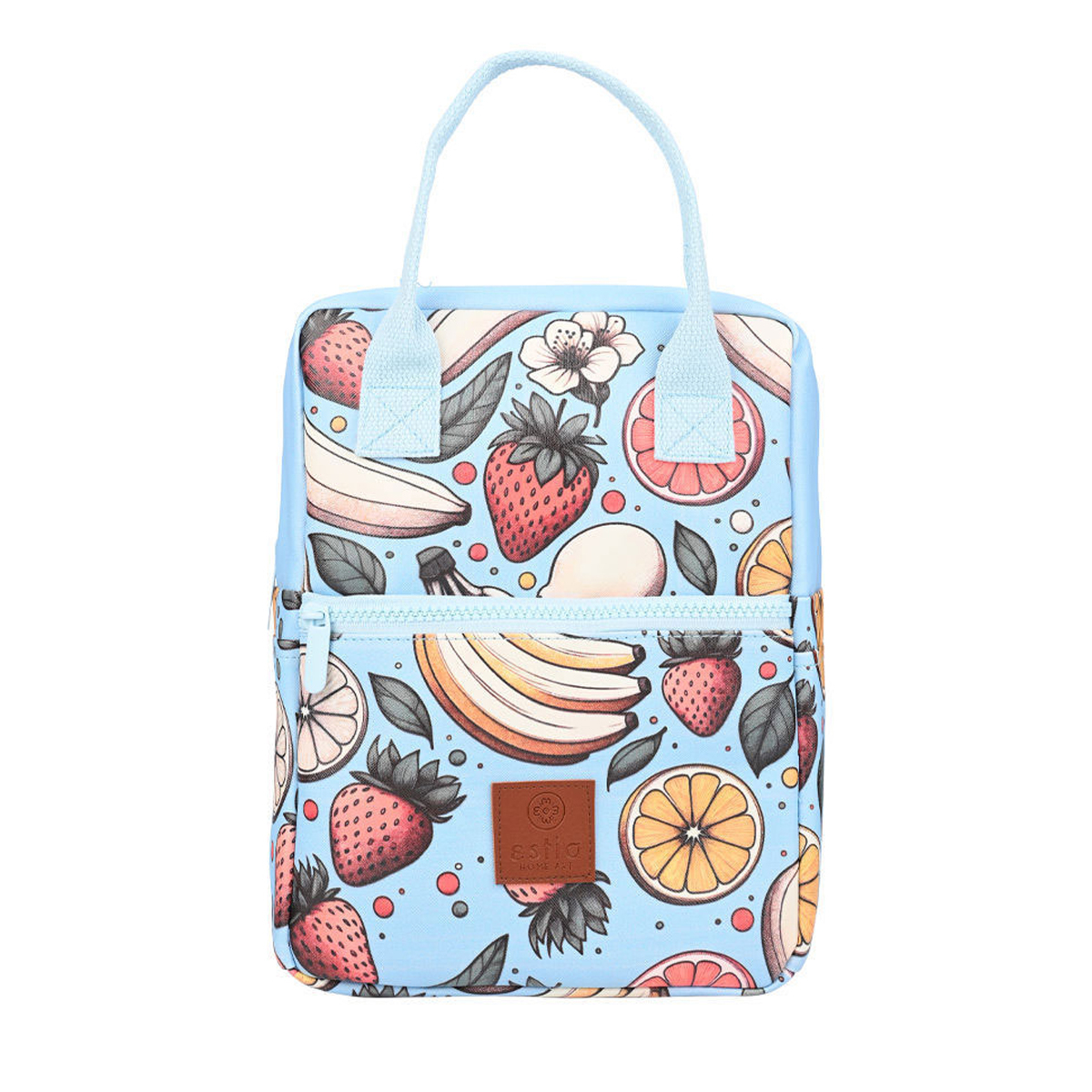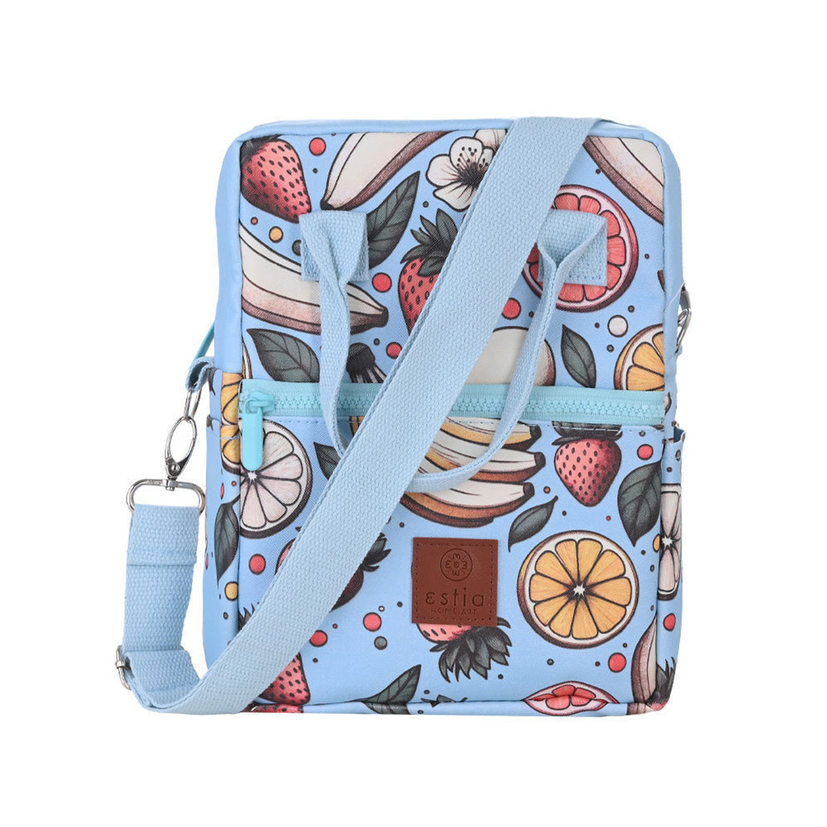 Ισοθερμική τσάντα φαγητού από την εταιρεία εstia σε γαλάζιο χρώμα με πολύχρωμο σχέδιο. Είναι μέρος της συλλογής "Save The Aegean". Η εταιρεία εstia συνεισφέρει στον οργανισμό "Save The Aegean" με 1% επί των πωλήσεων, για καθαρότερες θάλασσες και ένα καλύτερο αύριο. Η εξωτερική επιφάνεια της τσάντας είναι κατασκευασμένη από PVC leather, ένα ανθεκτικό συνθετικό υλικό που προσφέρει κομψή εμφάνιση και μεγάλη διάρκεια ζωής. Το υφασμα αυτό προσομοιώνει την εμφάνιση και υφή του φυσικού δέρματος, αλλά είναι κατασκευασμένο από PVC, ένα είδος πλαστικού. Διαθέτει ισοθερμική επένδυση και η τσάντα κλείνει με φερμουάρ. Θήκη για μπουκάλι ή θερμός εσωτερικά και εξωτερικά. Επίσης, έχει μια μπροστινή τσέπη με φερμουάρ για μικροαντικείμενα. Η άνετη λαβή της είναι πολύ πρακτική για μεταφορά. Στα πλαϊνά διαθέτει θηλιές για να βάλετε το λουρί και να μπορείτε να την κρεμάτε είτε από τον ώμο είτε χιαστί. Ιδανική για το γραφείο, το σχολείο και οποιαδήποτε άλλη δραστηριότητα. Συνδυάστε το με το λουράκι τσάντας Bermuda Green για ένα ολοκληρωμένο αποτέλεσμα. *Το λουρί πωλείται ξεχωριστά.*